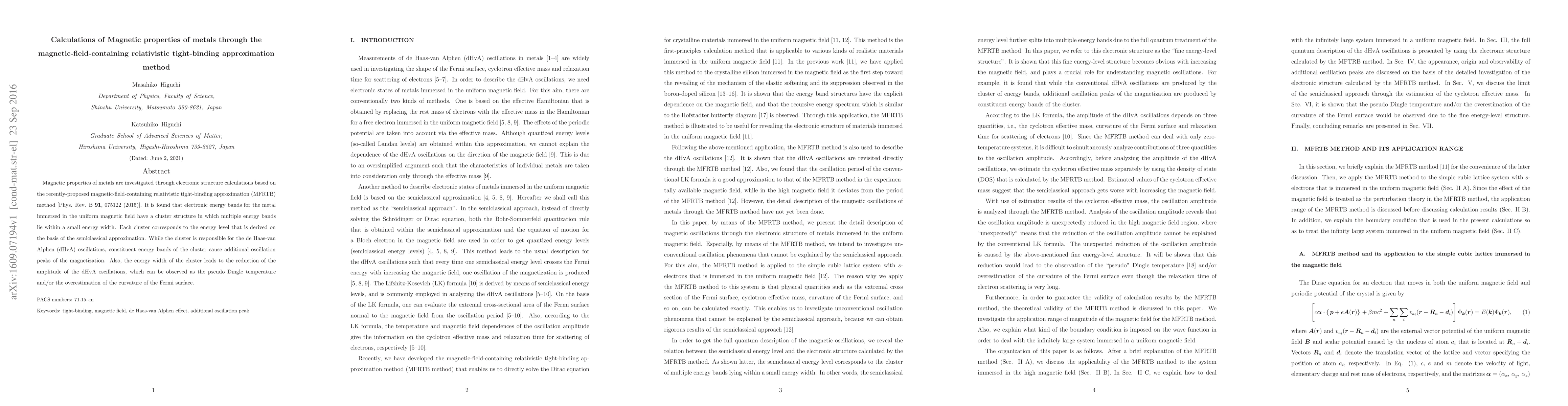 Magnetic properties of metals are investigated through electronic structure calculations based on the recently-proposed magnetic-field-containing relativistic tight-binding approximation (MFRTB) method [Phys. Rev. B \textbf{91}, 075122 (2015)]. It is found that electronic energy bands for the metal immersed in the uniform magnetic field have a cluster structure in which multiple energy bands lie within a small energy width. Each cluster corresponds to the energy level that is derived on the basis of the semiclassical approximation. While the cluster is responsible for the de Haas-van Alphen (dHvA) oscillations, constituent energy bands of the cluster cause additional oscillation peaks of the magnetization. Also, the energy width of the cluster leads to the reduction of the amplitude of the dHvA oscillations, which can be observed as the pseudo Dingle temperature and/or the overestimation of the curvature of the Fermi surface.