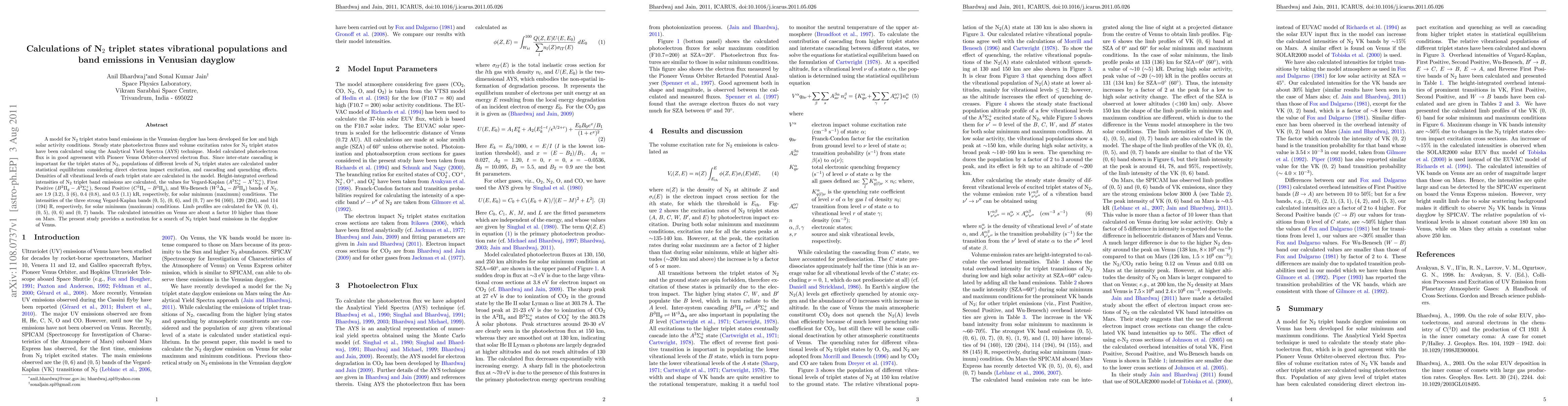 This paper develops a model for N2 triplet states band emissions in the Venusian dayglow, calculating vibrational populations and emissions under varying solar activity. The results show intensities for several N2 bands that are significantly higher than on Mars, suggesting a strong dayglow on Venus.