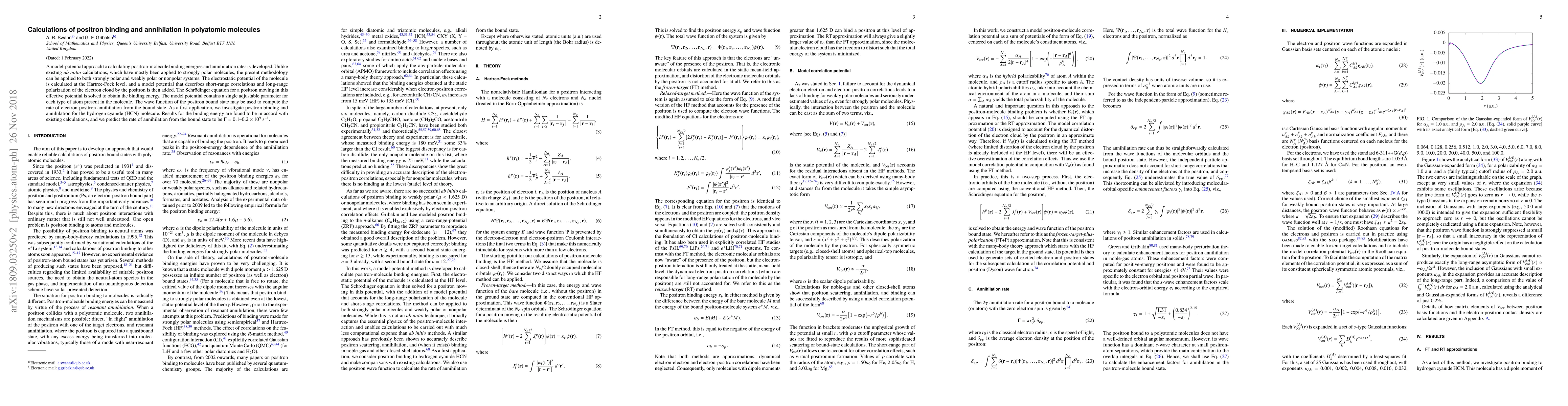 This paper develops a model-potential approach to calculate positron binding energies and annihilation rates in polyatomic molecules, applicable to both polar and nonpolar systems. The method predicts annihilation rates for hydrogen cyanide (HCN), finding $\Gamma=0.1$--$0.2 \times 10^9~\text{s}^{-1}$.