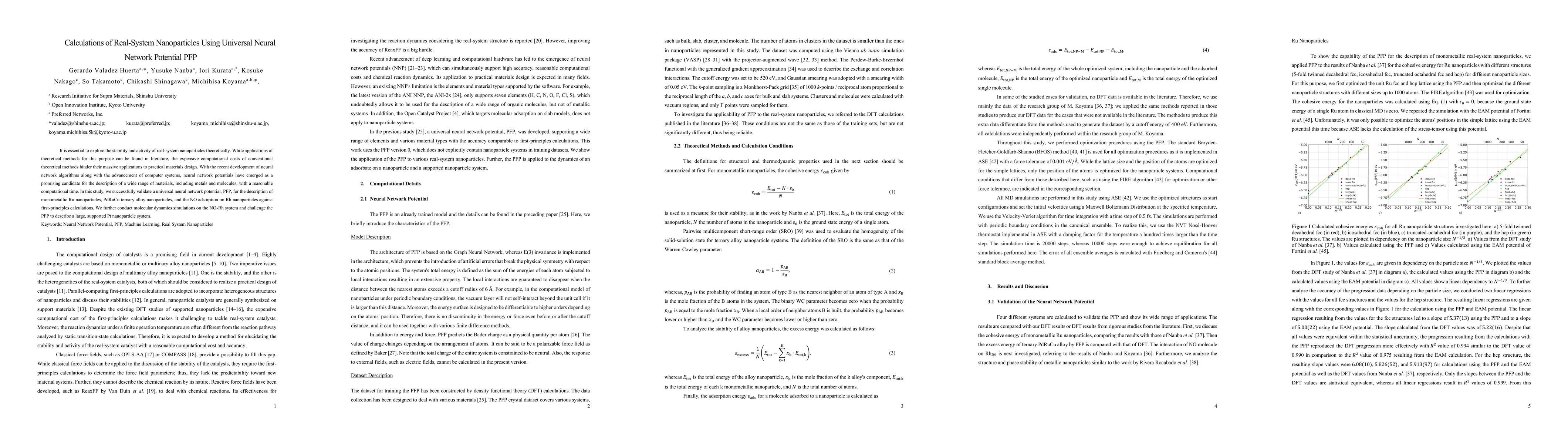 This study successfully validates a universal neural network potential, PFP, for describing monometallic Ru nanoparticles, PdRuCu ternary alloy nanoparticles, and NO adsorption on Rh nanoparticles, matching first-principles calculations. Molecular dynamics simulations on the NO-Rh system and large, supported Pt nanoparticle systems further test the PFP's capability.