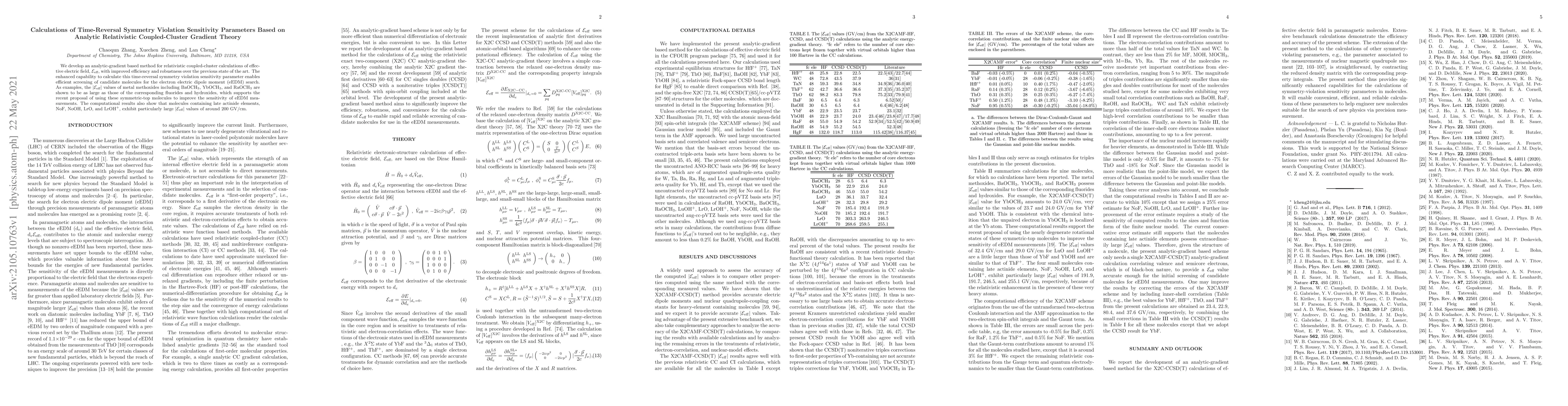 We develop an analytic-gradient based method for relativistic coupled-cluster calculations of effective electric field, $\mathcal{E}_{\text{eff}}$, with improved efficiency and robustness over the previous state of the art. The enhanced capability to calculate this time-reversal symmetry violation sensitivity parameter enables efficient screening of candidate molecules for the electron electric dipole moment (eEDM) search. As examples, the |$\mathcal{E}_{\text{eff}}$| values of metal methoxides including BaOCH$_3$, YbOCH$_3$, and RaOCH$_3$ are shown to be as large as those of the corresponding fluorides and hydroxides, which supports the recent proposal of using these symmetric-top molecules to improve the sensitivity of eEDM measurements. The computational results also show that molecules containing late actinide elements, NoF, NoOH, LrO, and LrOH$^+$, exhibit particularly large |$\mathcal{E}_{\text{eff}}$| values of around 200 GV/cm.