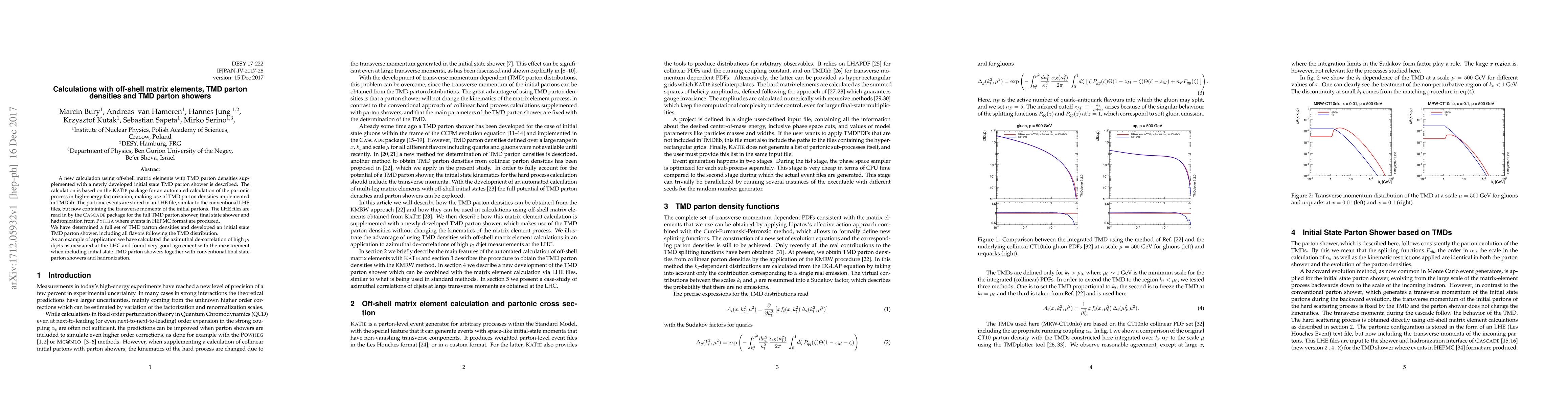 A new calculation using off-shell matrix elements with TMD parton densities supplemented with a newly developed initial state TMD parton shower is described. The calculation is based on the KaTie package for an automated calculation of the partonic process in high-energy factorization, making use of TMD parton densities implemented in TMDlib. The partonic events are stored in an LHE file, similar to the conventional LHE files, but now containing the transverse momenta of the initial partons. The LHE files are read in by the CASCADE package for the full TMD parton shower, final state shower and hadronization from PYTHIA where events in HEPMC format are produced. We have determined a full set of TMD parton densities and developed an initial state TMD parton shower, including all flavors following the TMD distribution. As an example of application we have calculated the azimuthal de-correlation of high pt dijets as measured at the LHC and found very good agreement with the measurement when including initial state TMD parton showers together with conventional final state parton showers and hadronization.