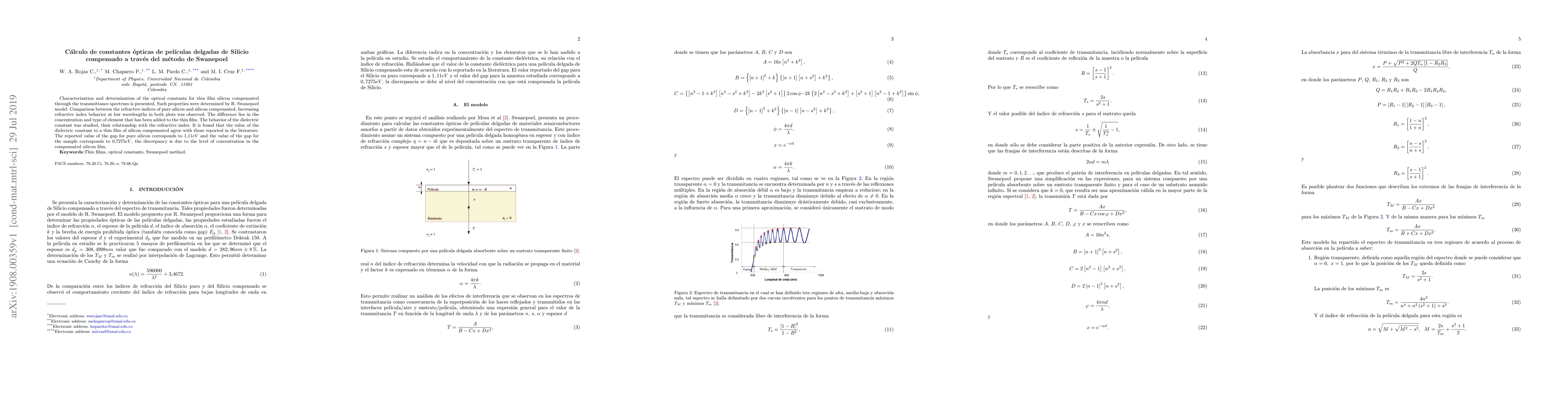 Characterization and determination of the optical constants for thin film silicon compensated through the transmittance spectrum is presented. Such properties were determined by R. Swanepoel model. Comparison between the refractive indices of pure silicon and silicon compensated. Increasing refractive index behavior at low wavelengths in both plots was observed. The difference lies in the concentration and type of element that has been added to the thin film. The behavior of the dielectric constant was studied, their relationship with the refractive index. It is found that the value of the dielectric constant to a thin film of silicon compensated agree with those reported in the literature. The reported value of the gap for pure silicon corresponds to $ 1.11eV $ and the value of the gap for the sample corresponds to $ 0.7275eV $, the discrepancy is due to the level of concentration in the compensated silicon film.