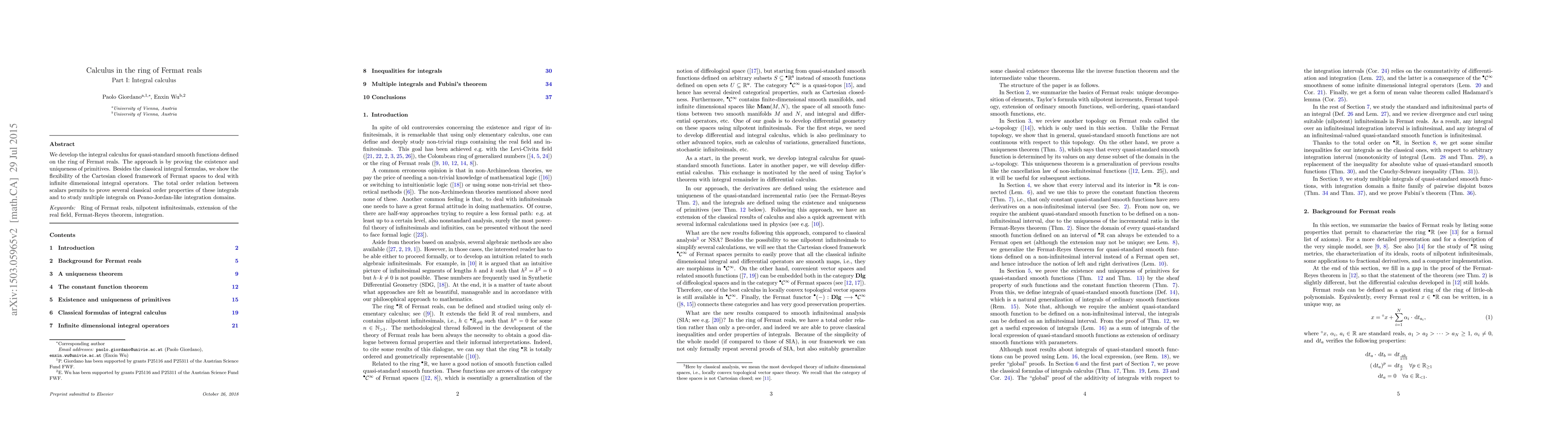 We develop the integral calculus for quasi-standard smooth functions defined on the ring of Fermat reals. The approach is by proving the existence and uniqueness of primitives. Besides the classical integral formulas, we show the flexibility of the Cartesian closed framework of Fermat spaces to deal with infinite dimensional integral operators. The total order relation between scalars permits to prove several classical order properties of these integrals and to study multiple integrals on Peano-Jordan-like integration domains.