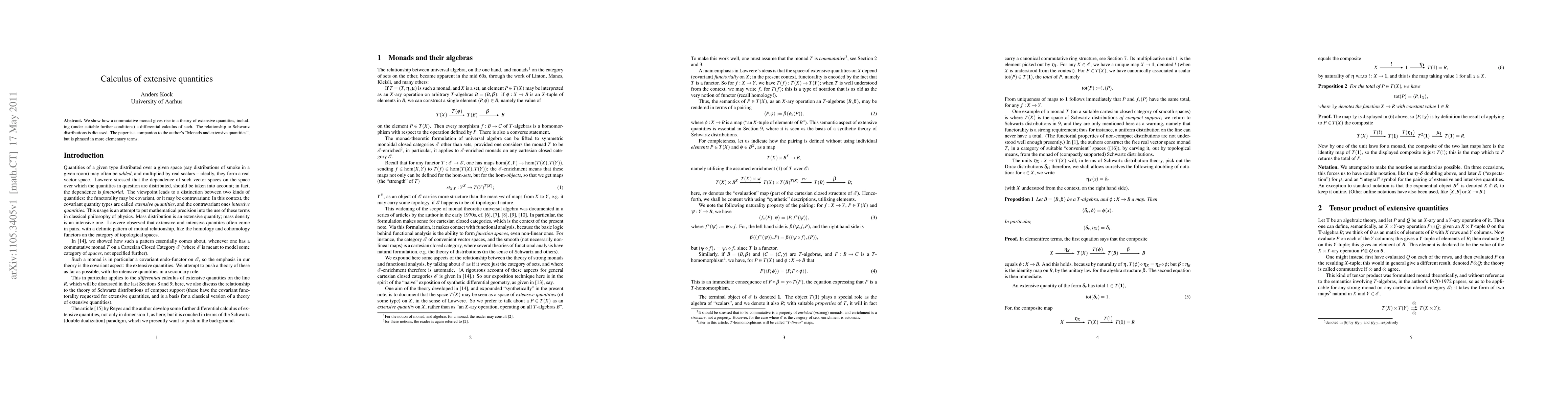 A commutative monad is used to develop a theory of extensive quantities, including a differential calculus, in this paper. The approach relates to Schwartz distributions and provides an elementary explanation of the concept.
