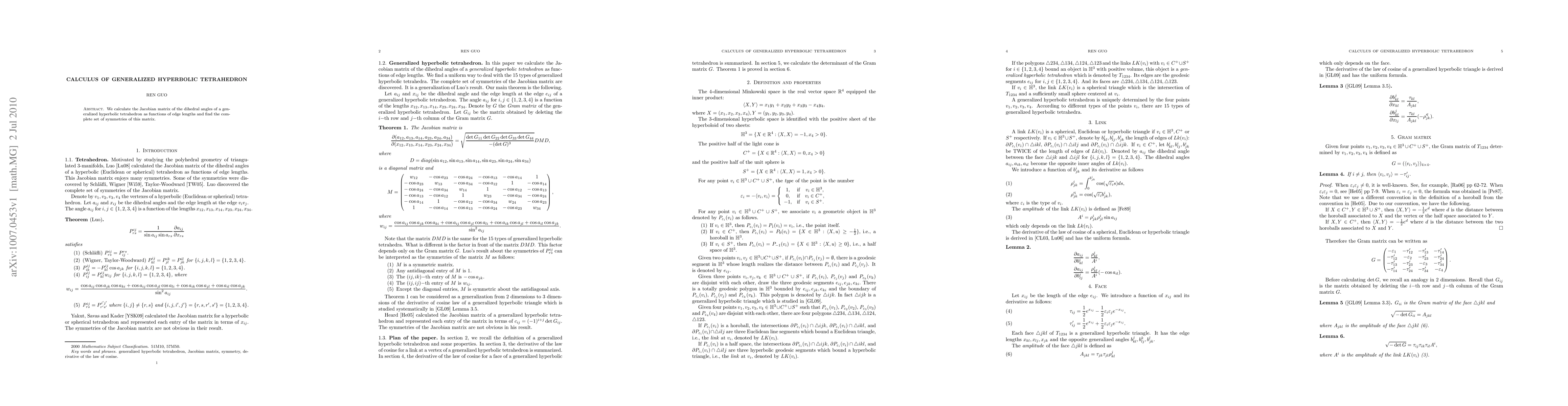 We calculate the Jacobian matrix of the dihedral angles of a generalized hyperbolic tetrahedron as functions of edge lengths and find the complete set of symmetries of this matrix.