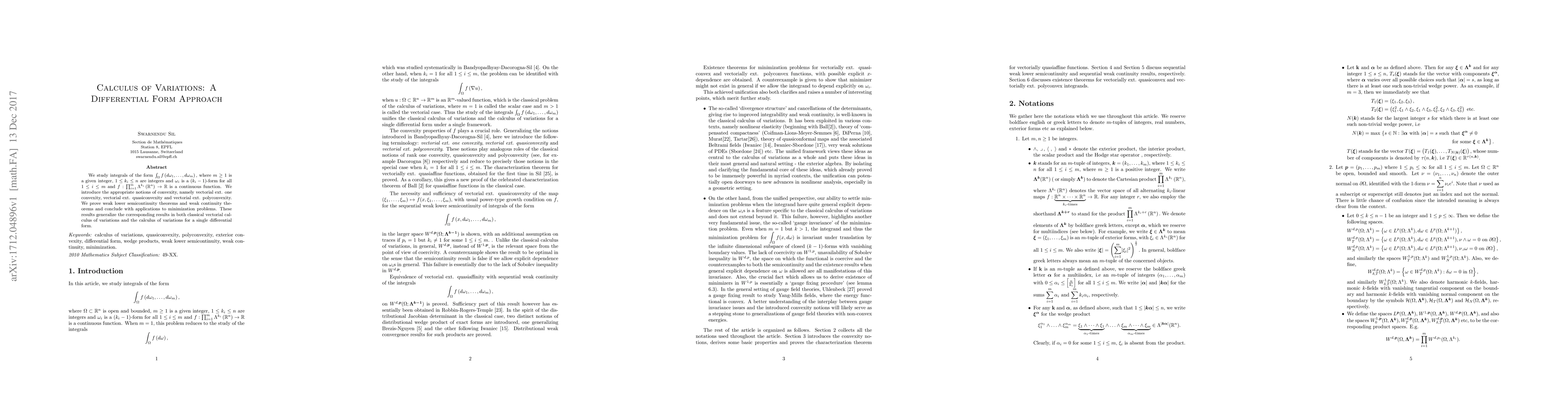 This paper explores integrals involving differential forms and introduces vectorial extended notions of convexity. It proves theorems on weak lower semicontinuity and weak continuity, with applications to minimization problems, generalizing classical vectorial calculus of variations.