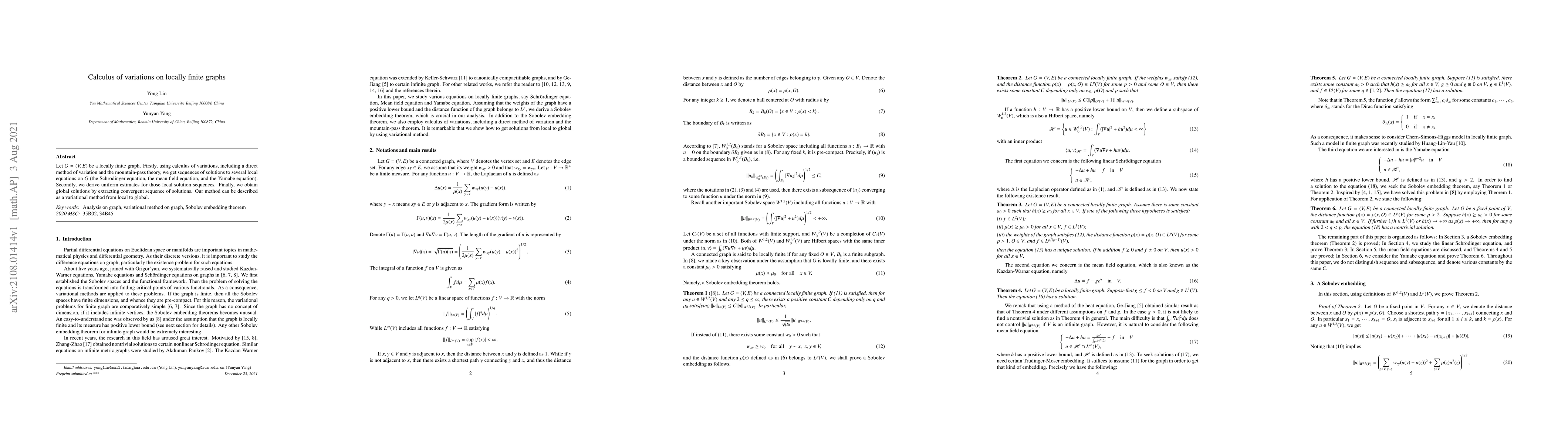 This research paper uses calculus of variations to find global solutions on locally finite graphs, starting from local equations like the Schr"odinger equation and mean field equation, with the goal of achieving a global variational method.