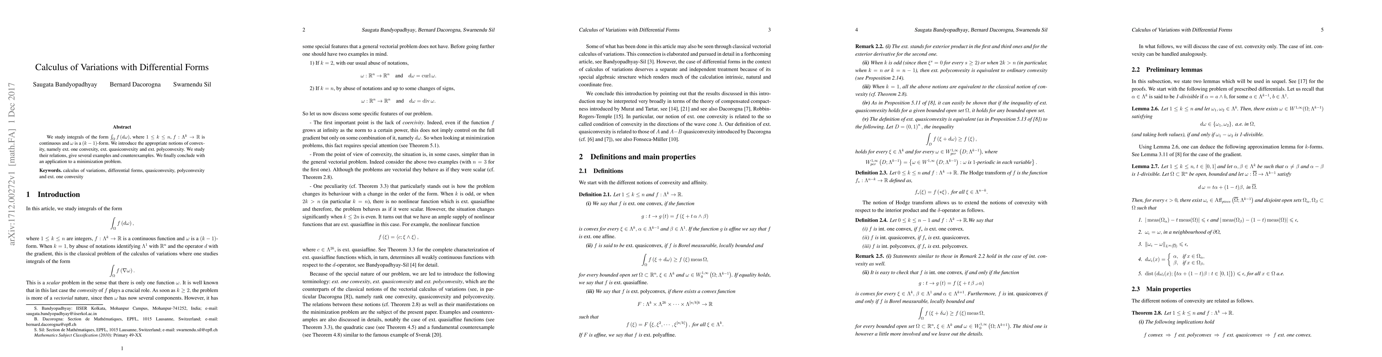 The paper explores integrals of differential forms with convexity properties, providing examples and counterexamples to understand their relationships. It concludes with an application to a minimization problem, shedding light on the implications of these convexity notions in calculus of variations.