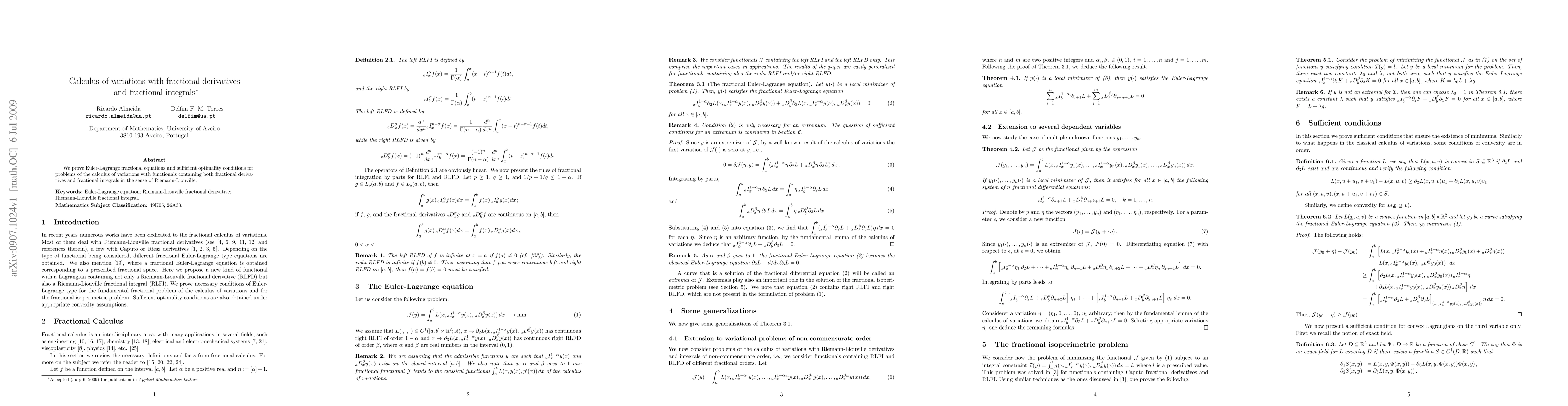 Summary: This paper establishes the Euler-Lagrange fractional equations and sufficient optimality conditions for variational problems involving functionals that incorporate both Riemann-Liouville fractional derivatives and integrals. The results extend classical variational calculus to the fractional setting.