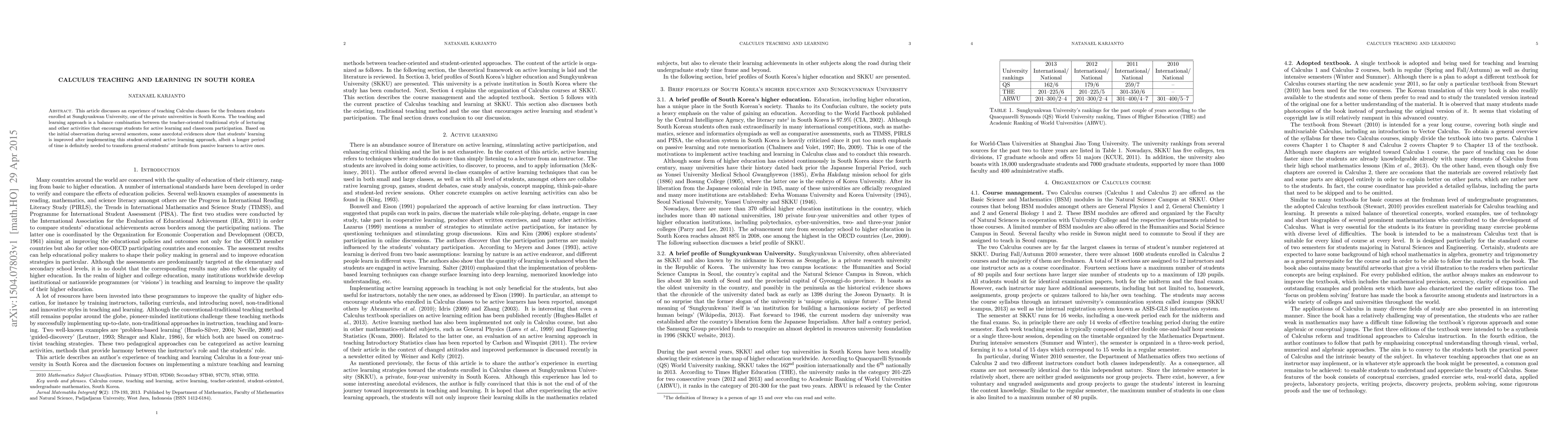 This study explores the integration of traditional lecturing with active learning strategies in teaching Calculus at Sungkyunkwan University, noting improved student learning outcomes and the gradual shift from passive to active participation. Long-term changes in student attitudes are still required.