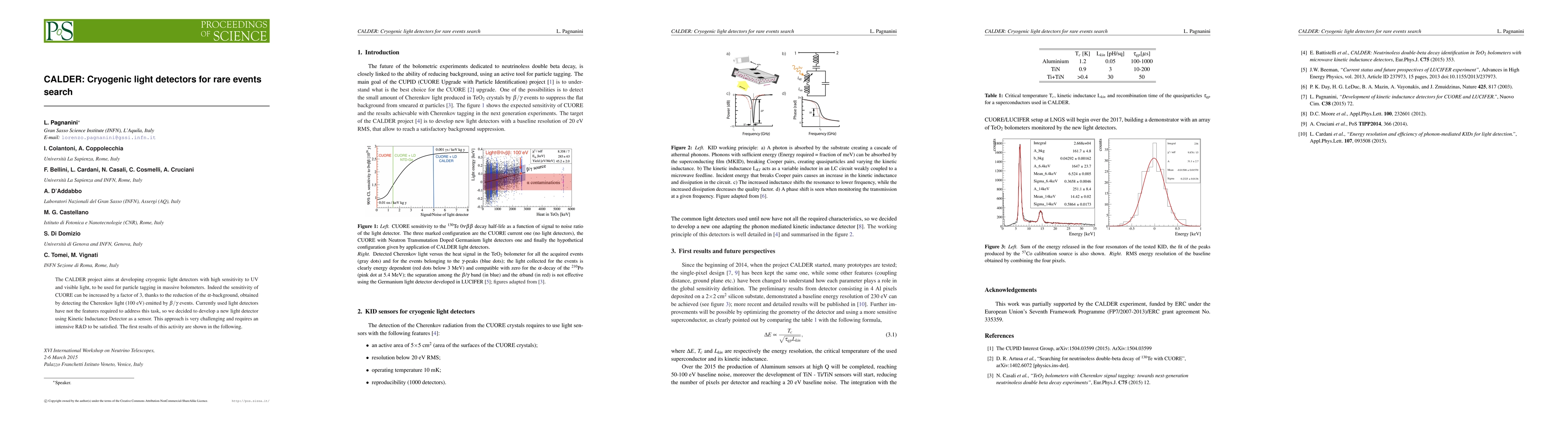 The CALDER project aims at developing cryogenic light detectors with high sensitivity to UV and visible light, to be used for particle tagging in massive bolometers. Indeed the sensitivity of CUORE can be increased by a factor of 3, thanks to the reduction of the $\alpha$-background, obtained by detecting the Cherenkov light (100 eV) emitted by $\beta/\gamma$ events. Currently used light detectors have not the features required to address this task, so we decided to develop a new light detector using Kinetic Inductance Detector as a sensor. This approach is very challenging and requires an intensive R$\&$D to be satisfied. The first results of this activity are shown in the following.