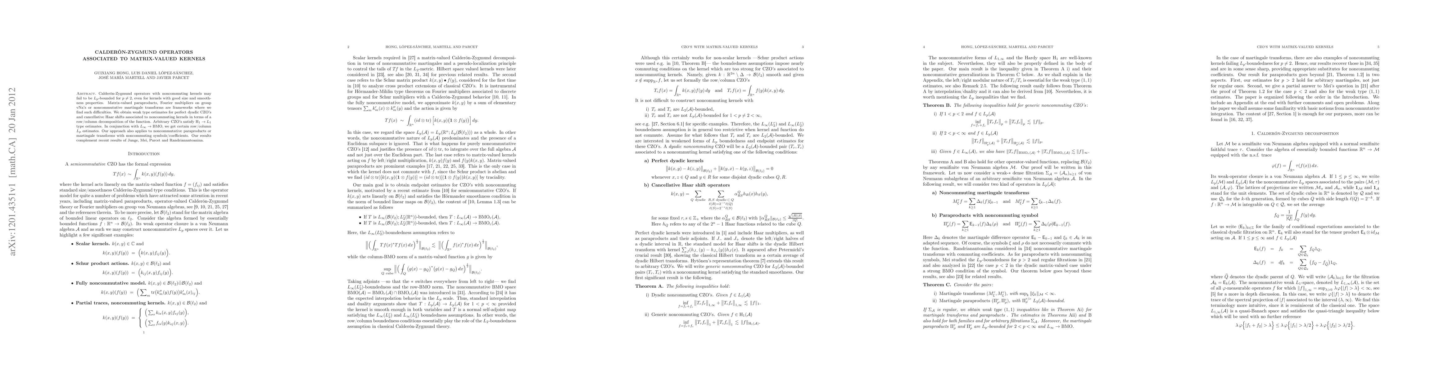 Calder\'on-Zygmund operators with noncommuting kernels may fail to be Lp-bounded for $p \neq 2$, even for kernels with good size and smoothness properties. Matrix-valued paraproducts, Fourier multipliers on group vNa's or noncommutative martingale transforms are frameworks where we find such difficulties. We obtain weak type estimates for perfect dyadic CZO's and cancellative Haar shifts associated to noncommuting kernels in terms of a row/column decomposition of the function. Arbitrary CZO's satisfy $H_1 \to L_1$ type estimates. In conjunction with $L_\infty \to BMO$, we get certain row/column Lp estimates. Our approach also applies to noncommutative paraproducts or martingale transforms with noncommuting symbols/coefficients. Our results complement recent results of Junge, Mei, Parcet and Randrianantoanina.