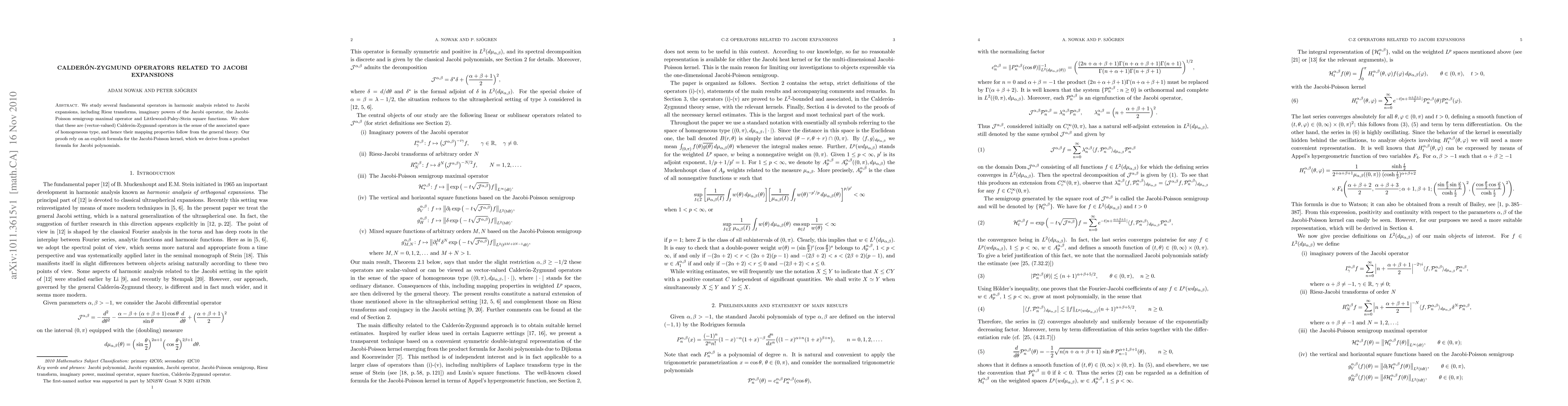 This paper investigates fundamental harmonic analysis operators tied to Jacobi expansions, proving that they are vector-valued Calderón-Zygmund operators in the context of associated homogeneous type spaces. The proofs leverage an explicit Jacobi-Poisson kernel formula derived from Jacobi polynomials.