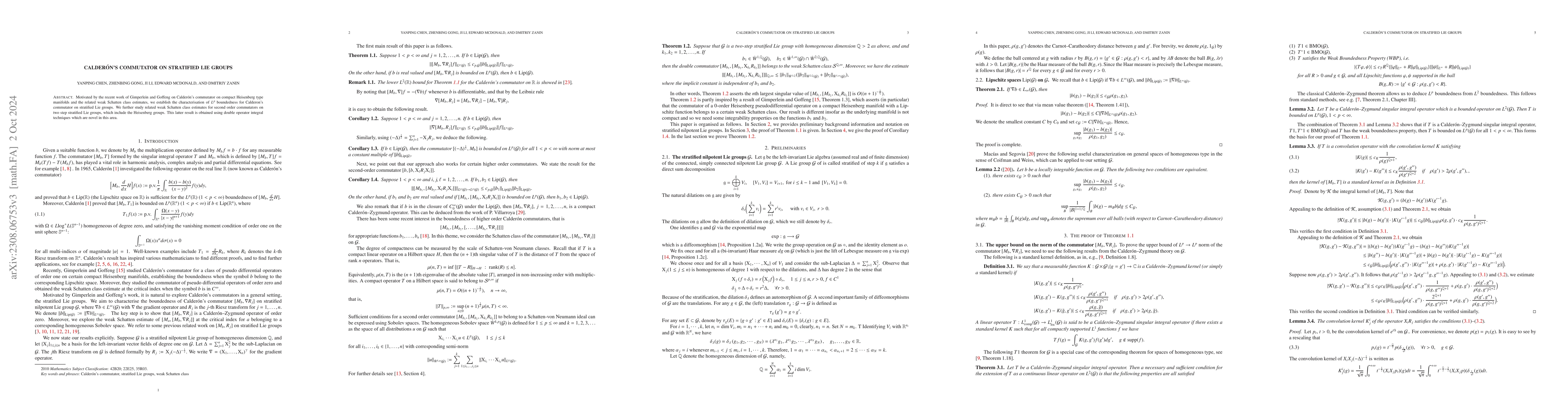 The paper establishes the characterization of L^p boundedness for Calderón's commutator on stratified Lie groups, utilizing results from previous work by Gimperlein and Goffeng on compact Heisenberg type manifolds and weak Schatten class estimates.