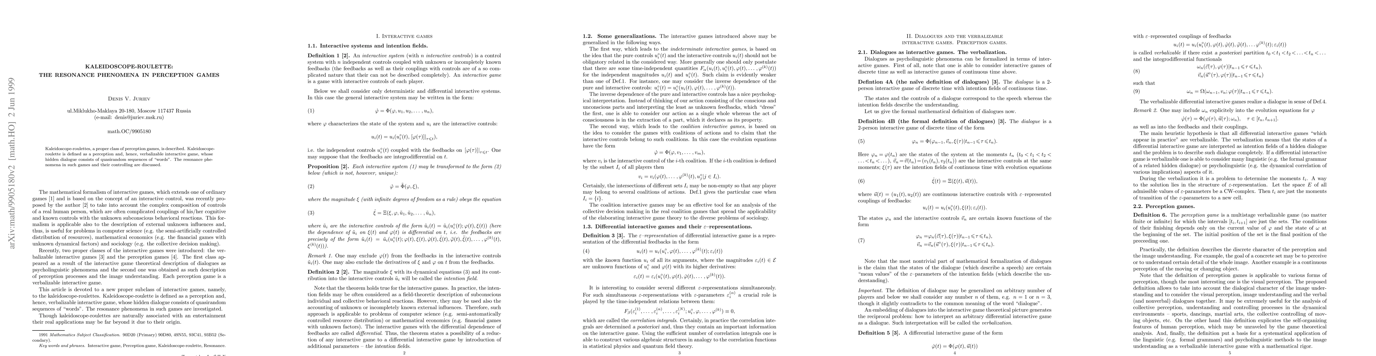 Kaleidoscope-roulettes, a proper class of perception games, is described. Kaleidoscope-roulette is defined as a perception and, hence, verbalizable interactive game, whose hidden dialogue consists of quasirandom sequences of ``words''. The resonance phenomena in such games and their controlling are discussed.
