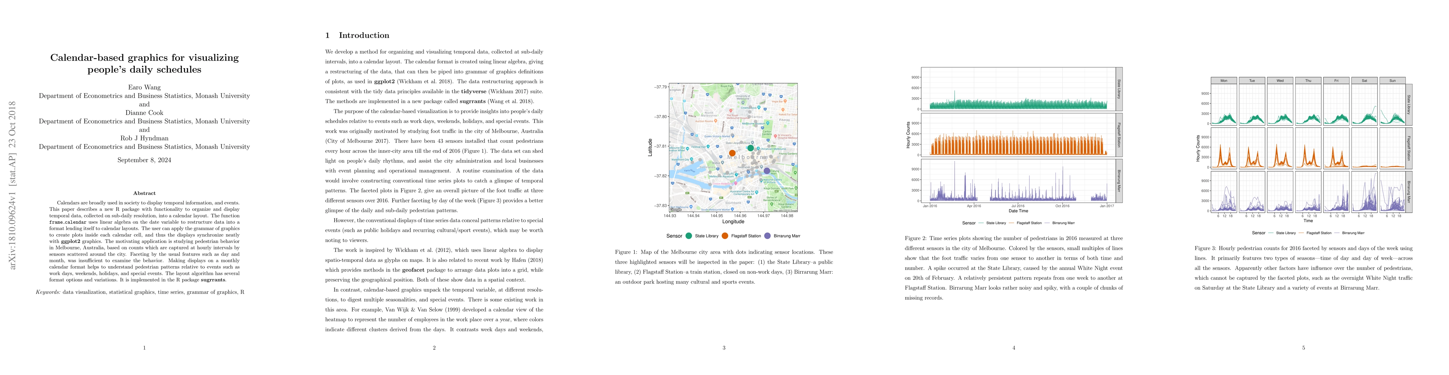 A new R package displays temporal data on a calendar layout to visualize daily schedules, allowing for easier analysis of pedestrian behavior patterns.