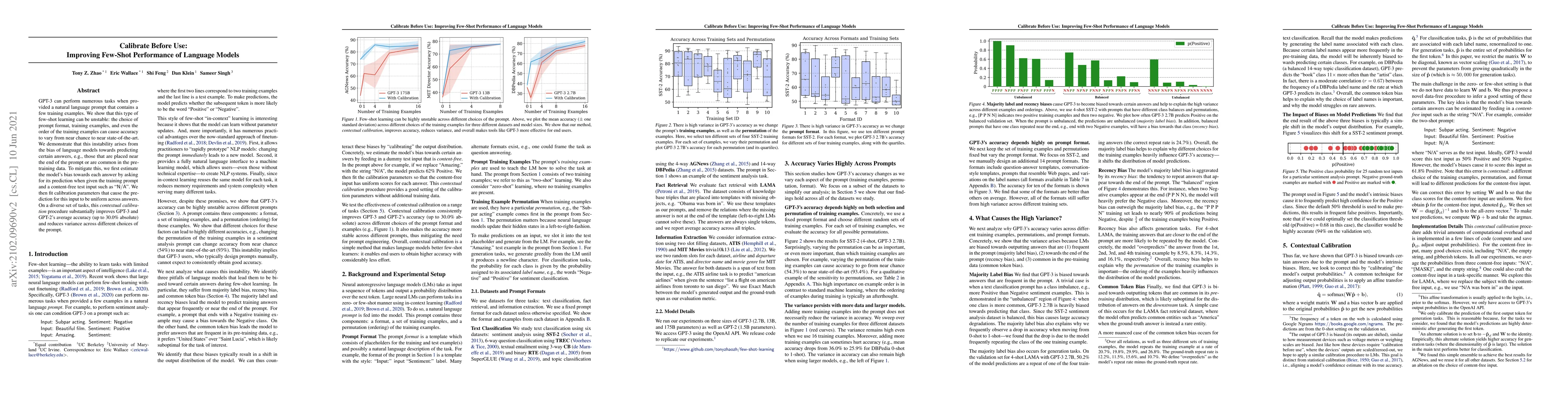 GPT-3 can perform numerous tasks when provided a natural language prompt that contains a few training examples. We show that this type of few-shot learning can be unstable: the choice of prompt format, training examples, and even the order of the training examples can cause accuracy to vary from near chance to near state-of-the-art. We demonstrate that this instability arises from the bias of language models towards predicting certain answers, e.g., those that are placed near the end of the prompt or are common in the pre-training data. To mitigate this, we first estimate the model's bias towards each answer by asking for its prediction when given the training prompt and a content-free test input such as "N/A". We then fit calibration parameters that cause the prediction for this input to be uniform across answers. On a diverse set of tasks, this contextual calibration procedure substantially improves GPT-3 and GPT-2's average accuracy (up to 30.0% absolute) and reduces variance across different choices of the prompt.