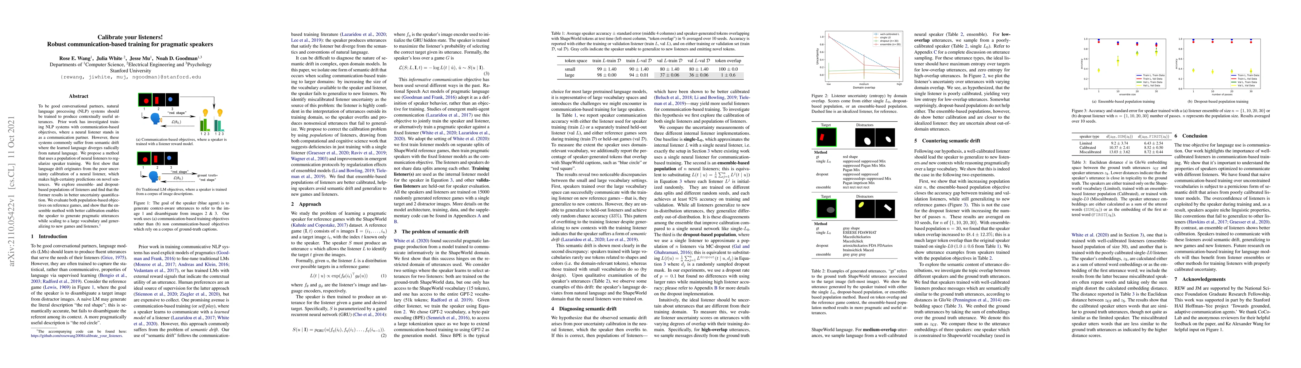 This paper proposes a method to train NLP systems to produce contextually useful utterances by using a population of neural listeners to regularize speaker training, addressing semantic drift. The study finds that ensemble-based populations of listeners improve uncertainty calibration and enable the speaker to generate pragmatic utterances.