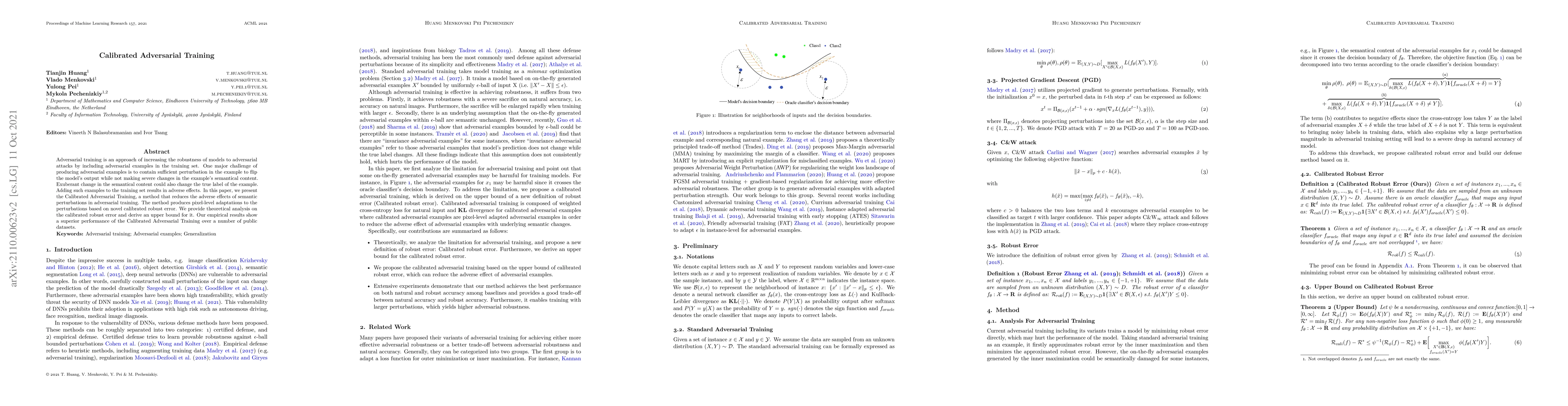Calibrated Adversarial Training introduces a method to enhance model robustness against adversarial attacks by adjusting perturbations to avoid semantic content changes. This approach achieves better performance than traditional adversarial training, as demonstrated through theoretical analysis and empirical results on various datasets.
