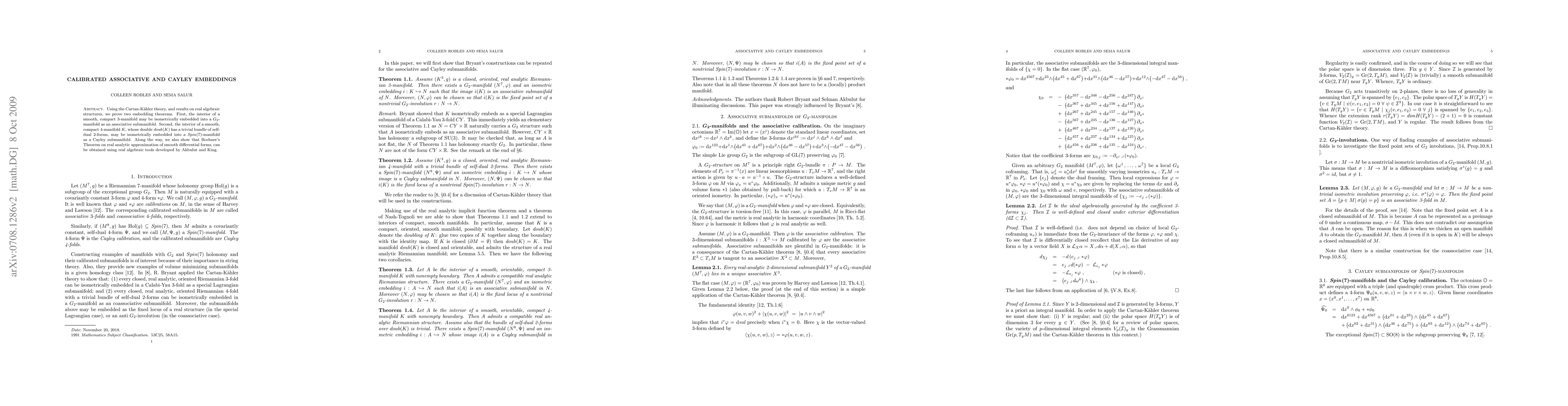Using the Cartan-Kahler theory, and results on real algebraic structures, we prove two embedding theorems. First, the interior of a smooth, compact 3-manifold may be isometrically embedded into a G_2-manifold as an associative submanifold. Second, the interior of a smooth, compact 4-manifold K, whose double has a trivial bundle of self-dual 2-forms, may be isometrically embedded into a Spin(7)-manifold as a Cayley submanifold. Along the way, we also show that Bochner's Theorem on real analytic approximation of smooth differential forms, can be obtained using real algebraic tools developed by Akbulut and King.