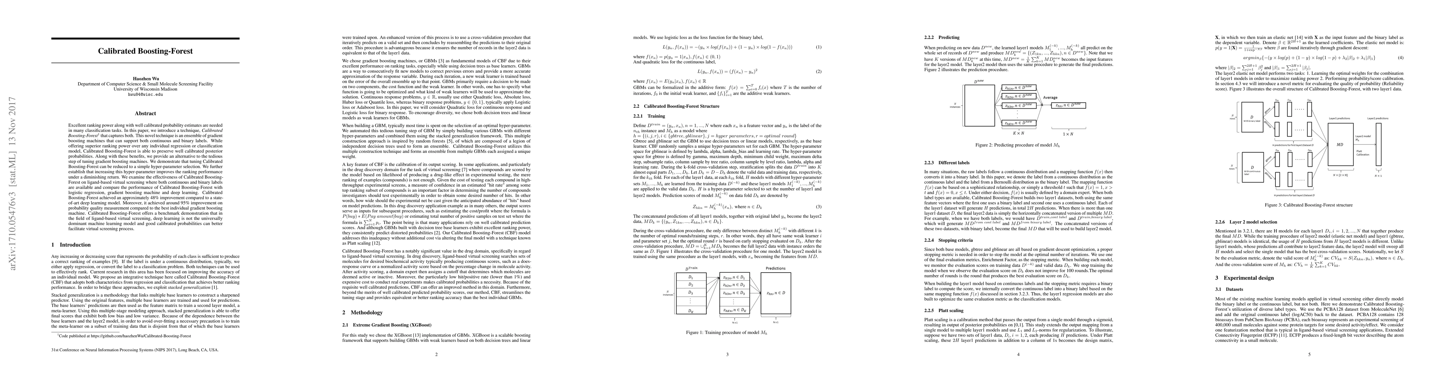 Calibrated Boosting-Forest is an ensemble technique that combines gradient boosting machines for superior ranking power and well-calibrated probability estimates. It outperforms individual regression or classification models, especially in ligand-based virtual screening, showing a 48% improvement over deep learning and a 95% improvement in probability calibration compared to the best gradient boosting machine.