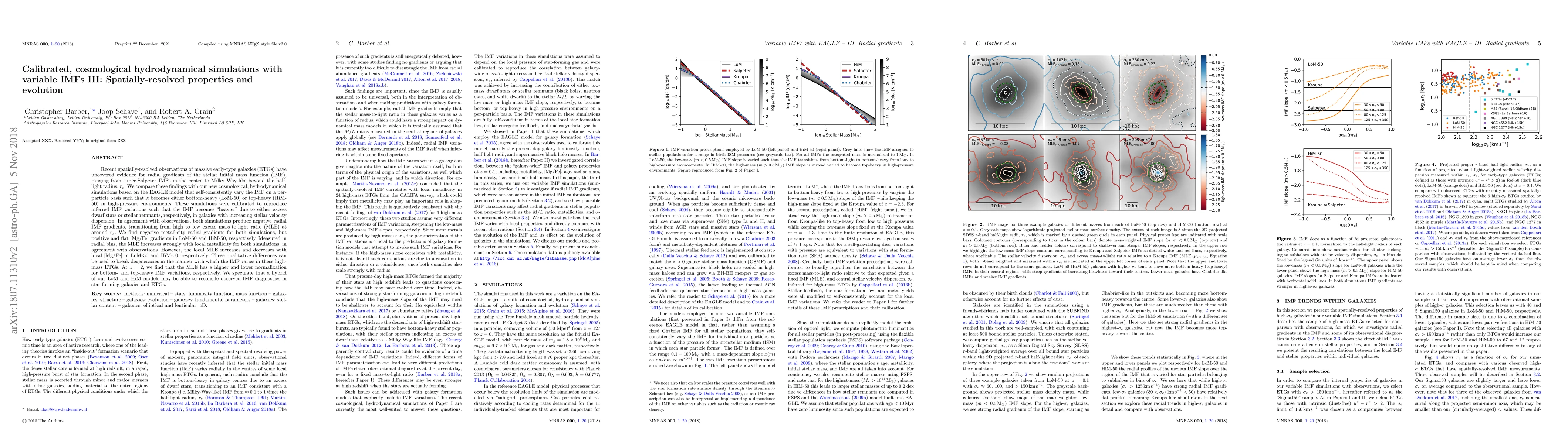 Recent spatially-resolved observations of massive early-type galaxies (ETGs) have uncovered evidence for radial gradients of the stellar initial mass function (IMF), ranging from super-Salpeter IMFs in the centre to Milky Way-like beyond the half-light radius, $r_e$. We compare these findings with our new cosmological, hydrodynamical simulations based on the EAGLE model that self-consistently vary the IMF on a per-particle basis such that it becomes either bottom-heavy (LoM-50) or top-heavy (HiM-50) in high-pressure environments. These simulations were calibrated to reproduce inferred IMF variations such that the IMF becomes "heavier" due to either excess dwarf stars or stellar remnants, respectively, in galaxies with increasing stellar velocity dispersion. In agreement with observations, both simulations produce negative radial IMF gradients, transitioning from high to low excess mass-to-light ratio (MLE) at around $r_e$. We find negative metallicity radial gradients for both simulations, but positive and flat [Mg/Fe] gradients in LoM-50 and HiM-50, respectively. Measured in radial bins, the MLE increases strongly with local metallicity for both simulations, in agreement with observations. However, the local MLE increases and decreases with local [Mg/Fe] in LoM-50 and HiM-50, respectively. These qualitative differences can be used to break degeneracies in the manner with which the IMF varies in these high-mass ETGs. At $z=2$, we find that the MLE has a higher and lower normalization for bottom- and top-heavy IMF variations, respectively. We speculate that a hybrid of our LoM and HiM models may be able to reconcile observed IMF diagnostics in star-forming galaxies and ETGs.