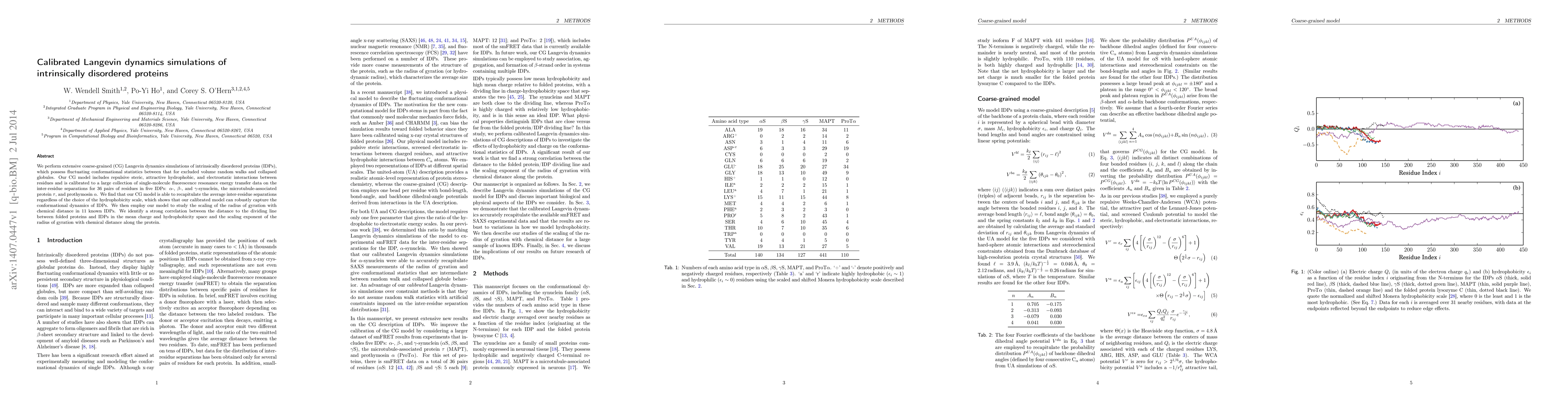 This paper presents coarse-grained Langevin dynamics simulations of intrinsically disordered proteins (IDPs), calibrated against single-molecule fluorescence data. The study finds that the model robustly captures IDPs' conformational dynamics and correlates the scaling of the radius of gyration with chemical distance to mean charge and hydrophobicity.