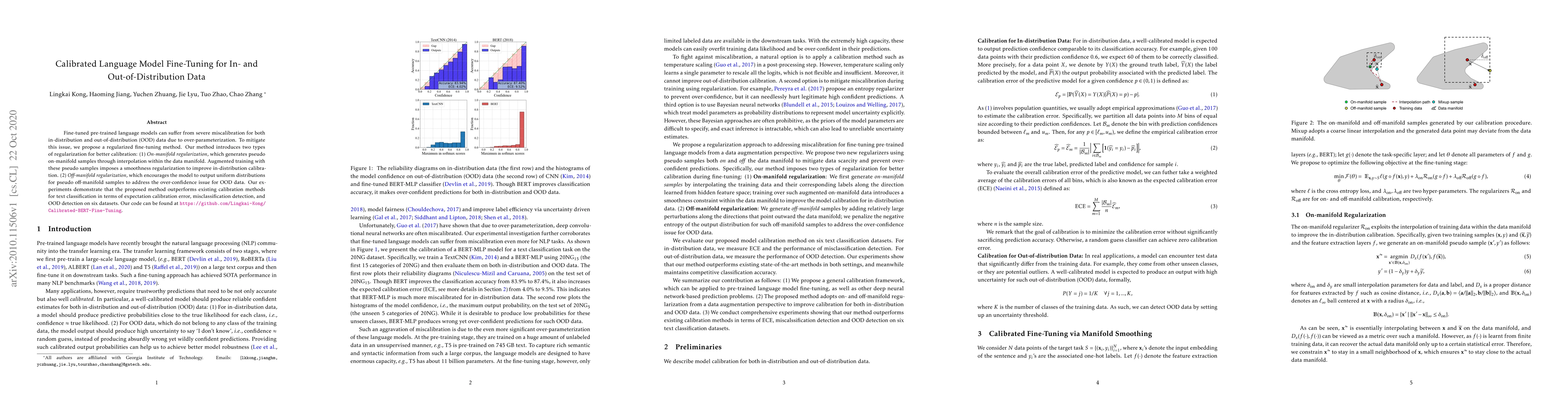 This paper proposes a regularized fine-tuning method to improve calibration in pre-trained language models for both in-distribution and out-of-distribution data. The method uses on-manifold and off-manifold regularization to enhance calibration and reduce over-confidence, achieving superior performance in calibration metrics across multiple datasets.