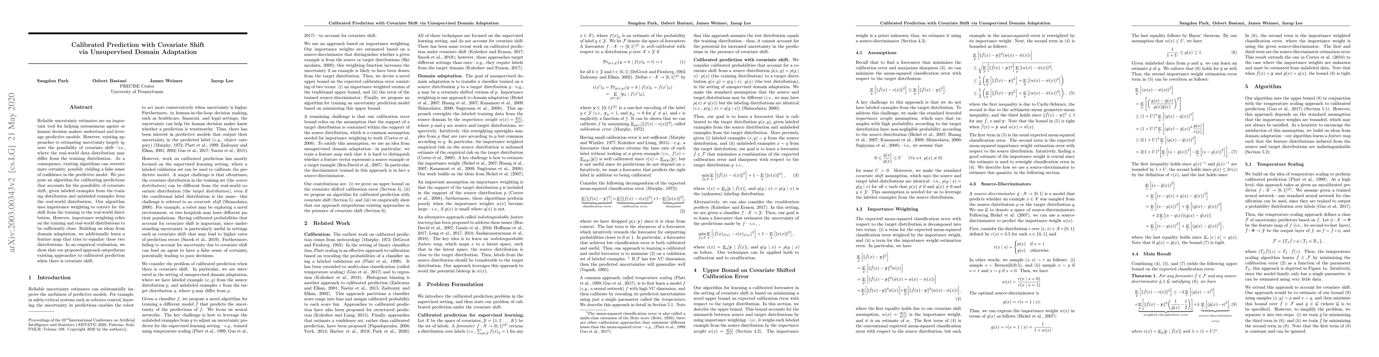This paper proposes an algorithm for calibrating predictions to account for covariate shift, where real-world data distributions differ from training distributions. It uses importance weighting and domain adaptation techniques to correct for these shifts and improve prediction calibration.