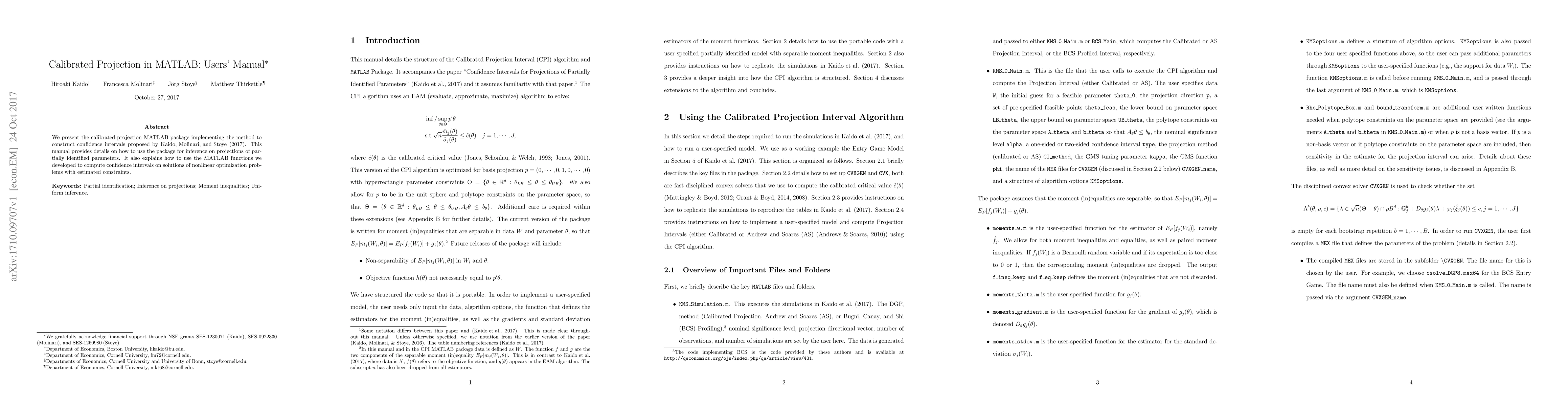 We present the calibrated-projection MATLAB package implementing the method to construct confidence intervals proposed by Kaido, Molinari and Stoye (2017). This manual provides details on how to use the package for inference on projections of partially identified parameters. It also explains how to use the MATLAB functions we developed to compute confidence intervals on solutions of nonlinear optimization problems with estimated constraints.