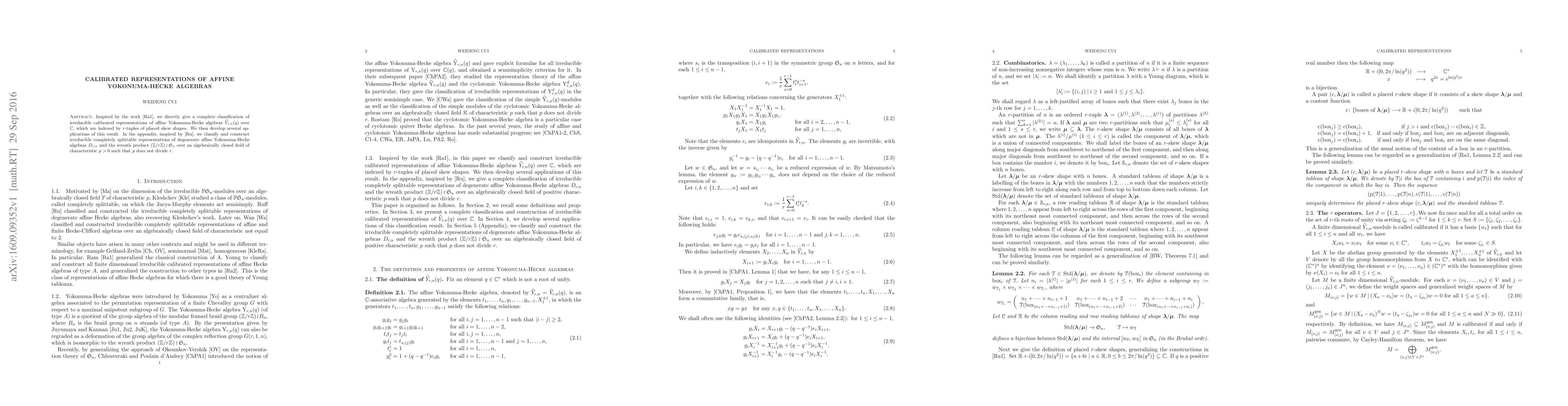 Inspired by the work [Ra1], we directly give a complete classification of irreducible calibrated representations of affine Yokonuma-Hecke algebras $\widehat{Y}_{r,n}(q)$ over $\mathbb{C},$ which are indexed by $r$-tuples of placed skew shapes. We then develop several applications of this result. In the appendix, inspired by [Ru], we classify and construct irreducible completely splittable representations of degenerate affine Yokonuma-Hecke algebras $D_{r,n}$ and the wreath product $(\mathbb{Z}/r\mathbb{Z})\wr \mathfrak{S}_{n}$ over an algebraically closed field of characteristic $p> 0$ such that $p$ does not divide $r$.
