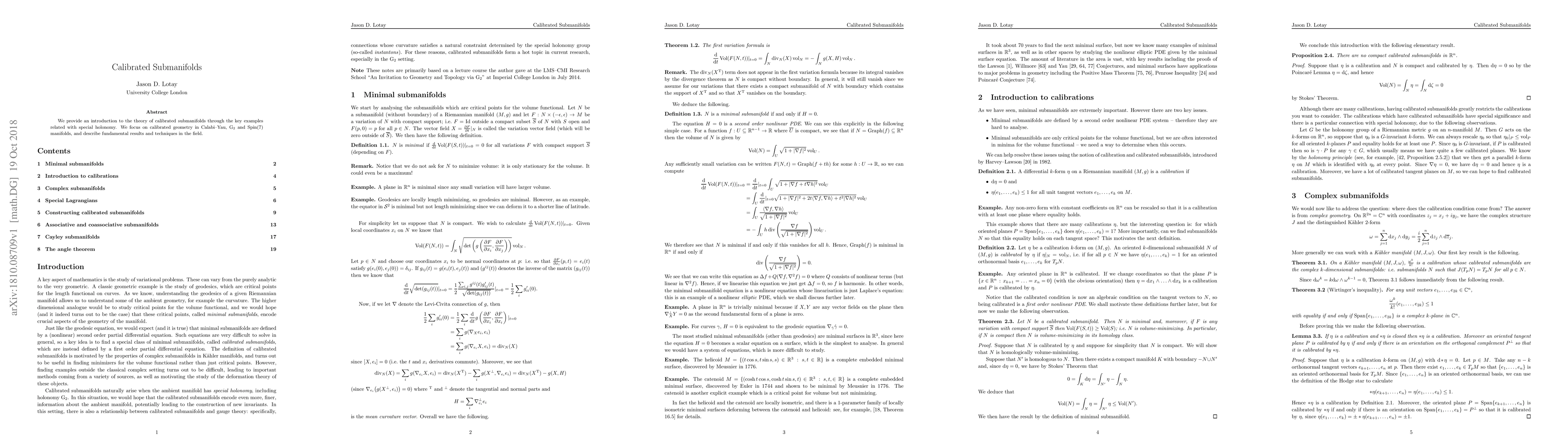 Summary: This paper introduces the theory of calibrated submanifolds, emphasizing examples related to special holonomy in Calabi-Yau, G$_2$, and Spin(7) manifolds, and outlines fundamental results and techniques in calibrated geometry.