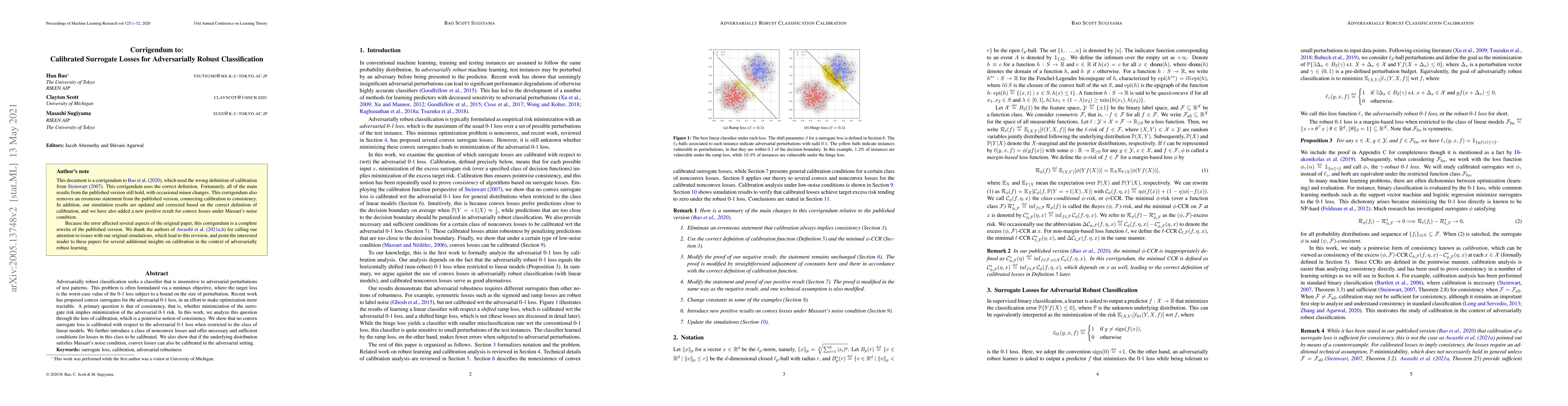 This paper investigates the calibration of convex surrogate losses for adversarially robust classification, demonstrating that no convex surrogate is calibrated for linear models. It introduces nonconvex losses and provides conditions for calibration, and shows that convex losses can be calibrated under Massart's noise condition.