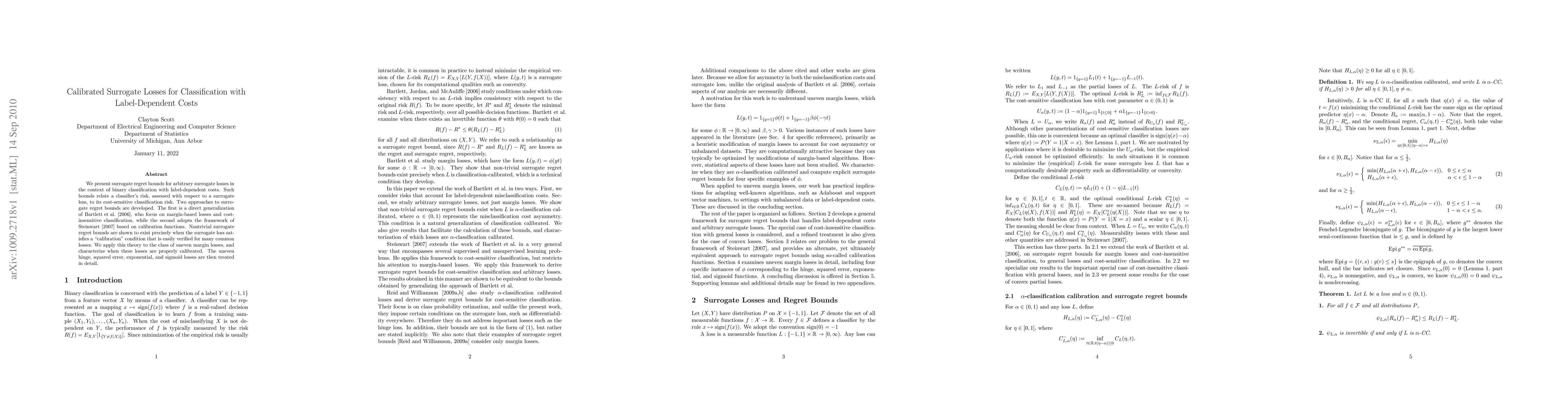 We present surrogate regret bounds for arbitrary surrogate losses in the context of binary classification with label-dependent costs. Such bounds relate a classifier's risk, assessed with respect to a surrogate loss, to its cost-sensitive classification risk. Two approaches to surrogate regret bounds are developed. The first is a direct generalization of Bartlett et al. [2006], who focus on margin-based losses and cost-insensitive classification, while the second adopts the framework of Steinwart [2007] based on calibration functions. Nontrivial surrogate regret bounds are shown to exist precisely when the surrogate loss satisfies a "calibration" condition that is easily verified for many common losses. We apply this theory to the class of uneven margin losses, and characterize when these losses are properly calibrated. The uneven hinge, squared error, exponential, and sigmoid losses are then treated in detail.