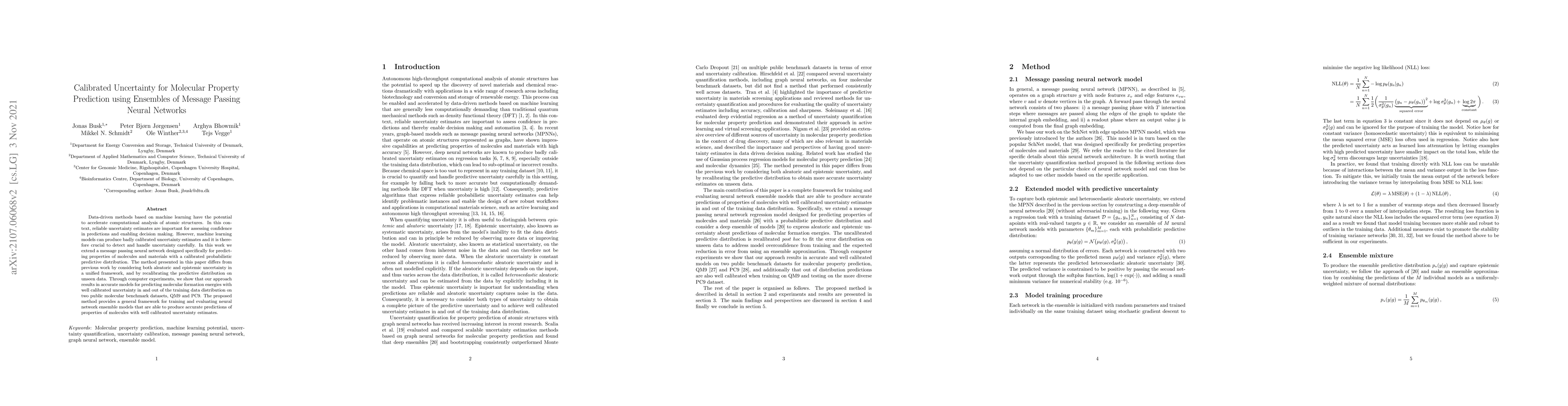 Data-driven methods based on machine learning have the potential to accelerate computational analysis of atomic structures. In this context, reliable uncertainty estimates are important for assessing confidence in predictions and enabling decision making. However, machine learning models can produce badly calibrated uncertainty estimates and it is therefore crucial to detect and handle uncertainty carefully. In this work we extend a message passing neural network designed specifically for predicting properties of molecules and materials with a calibrated probabilistic predictive distribution. The method presented in this paper differs from previous work by considering both aleatoric and epistemic uncertainty in a unified framework, and by recalibrating the predictive distribution on unseen data. Through computer experiments, we show that our approach results in accurate models for predicting molecular formation energies with well calibrated uncertainty in and out of the training data distribution on two public molecular benchmark datasets, QM9 and PC9. The proposed method provides a general framework for training and evaluating neural network ensemble models that are able to produce accurate predictions of properties of molecules with well calibrated uncertainty estimates.