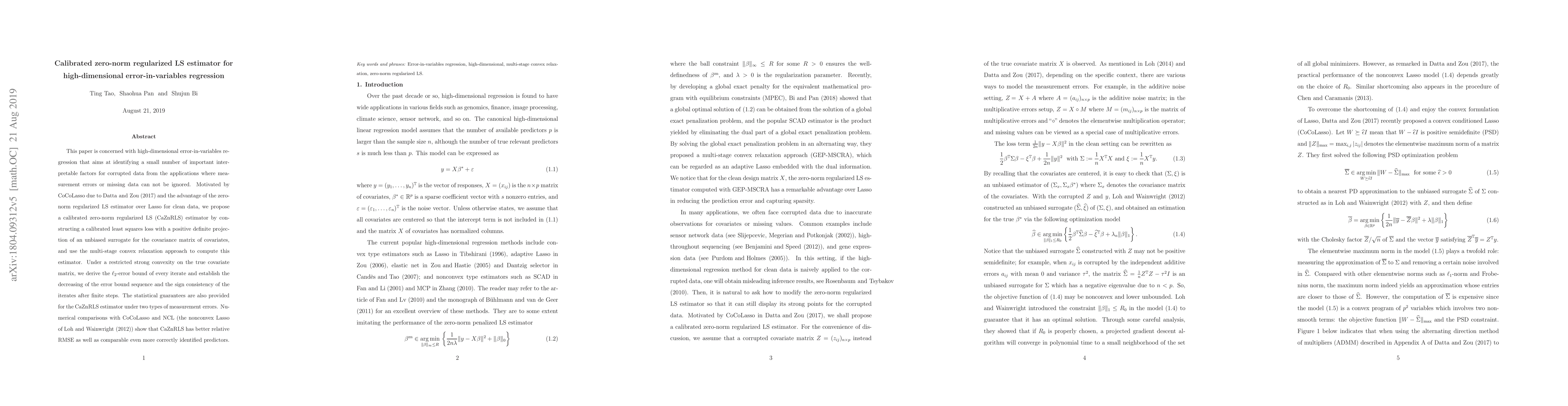 This paper proposes a calibrated zero-norm regularized least squares (CaZnRLS) estimator for high-dimensional error-in-variables regression, providing statistical guarantees and demonstrating superior performance in terms of both relative RMSE and predictor accuracy compared to CoCoLasso and NCL.