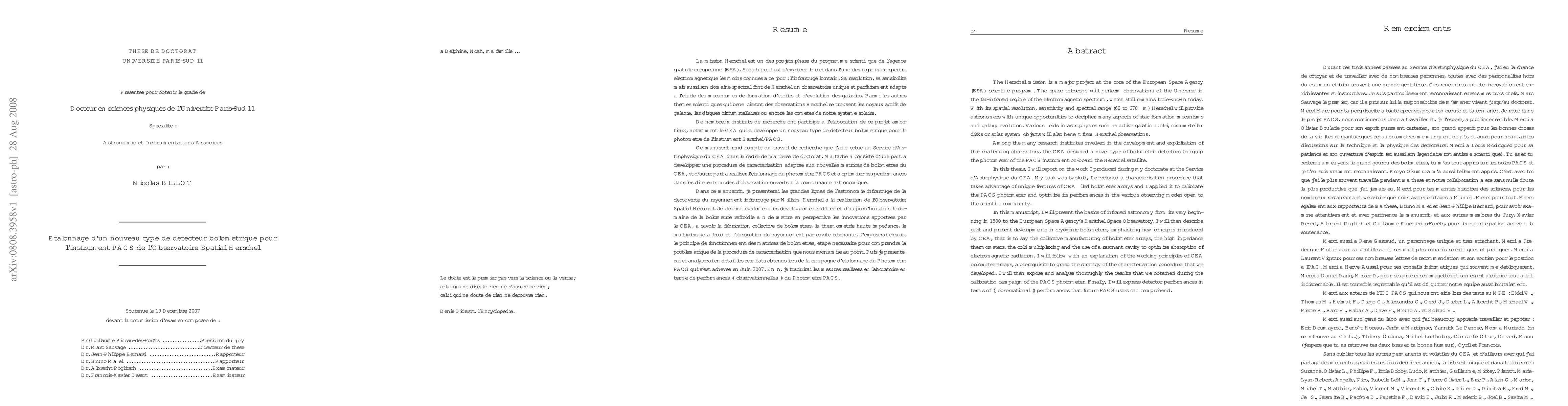 The Herschel Space Observatory is a corner stone mission of the European Space Agency (ESA) scientific program. With its spatial resolution, sensitivity and spectral range (60 to 670 microns) Herschel will provide astronomers with unique opportunities to decipher many aspects of star formation mecanisms and galaxy evolution. Among the many research institutes involved in the development and exploitation of this challenging observatory, the Commissariat a l'Energie Atomique (CEA) designed a novel type of bolometric detectors to equip the photometer of the PACS instrument on-board the Herschel satellite. In this thesis, I present the basics of infrared astronomy and past and present developments in cryogenic bolometers, emphasising on new concepts introduced by CEA, that is the collective manufacturing of bolometer arrays, the high impedance thermometers, the cold multiplexing and the use of a resonant cavity to optimize absorption of electromagnetic radiation. I follow with an in-depth explanation of the working principles of CEA bolometer arrays, a prerequisite to grasp the strategy of the characterisation procedure that we developed. I then expose and analyse thoroughly the results that we obtained during the calibration campaign of the PACS photometer. Finally, I express detector performances in terms of "observational" performances that future PACS users can comprehend (time constant -> PSF smearing, NEP -> sensitivity, etc.).