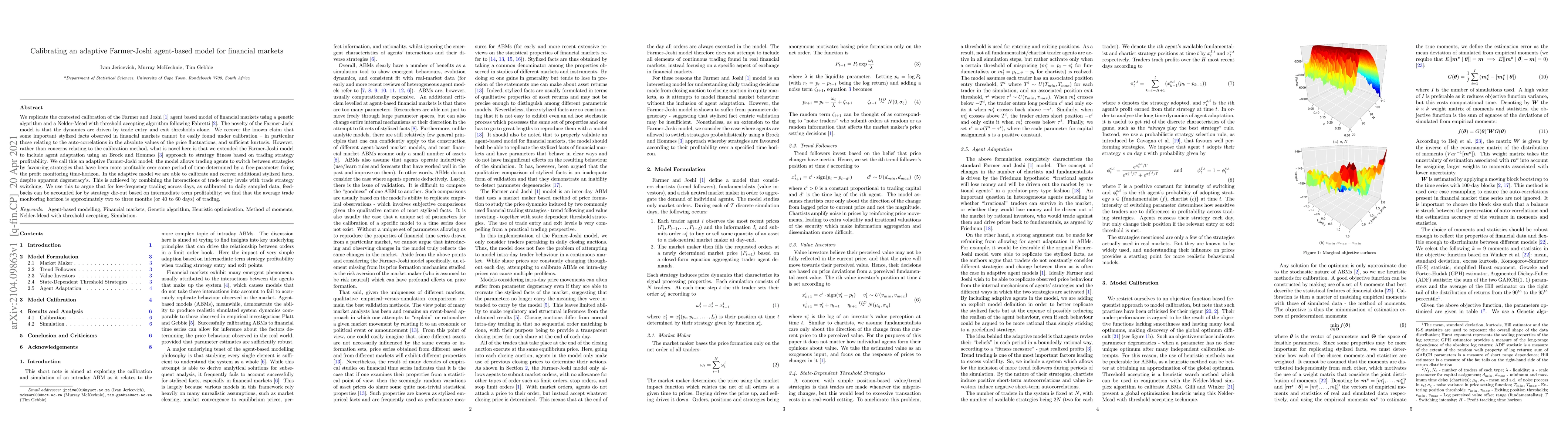 We replicate the contested calibration of the Farmer and Joshi agent based model of financial markets using a genetic algorithm and a Nelder-Mead with threshold accepting algorithm following Fabretti. The novelty of the Farmer-Joshi model is that the dynamics are driven by trade entry and exit thresholds alone. We recover the known claim that some important stylized facts observed in financial markets cannot be easily found under calibration -- in particular those relating to the auto-correlations in the absolute values of the price fluctuations, and sufficient kurtosis. However, rather than concerns relating to the calibration method, what is novel here is that we extended the Farmer-Joshi model to include agent adaptation using an Brock and Hommes approach to strategy fitness based on trading strategy profitability. We call this an adaptive Farmer-Joshi model: the model allows trading agents to switch between strategies by favouring strategies that have been more profitable over some period of time determined by a free-parameter fixing the profit monitoring time-horizon. In the adaptive model we are able to calibrate and recover additional stylized facts, despite apparent degeneracy's. This is achieved by combining the interactions of trade entry levels with trade strategy switching. We use this to argue that for low-frequency trading across days, as calibrated to daily sampled data, feed-backs can be accounted for by strategy die-out based on intermediate term profitability; we find that the average trade monitoring horizon is approximately two to three months (or 40 to 60 days) of trading.