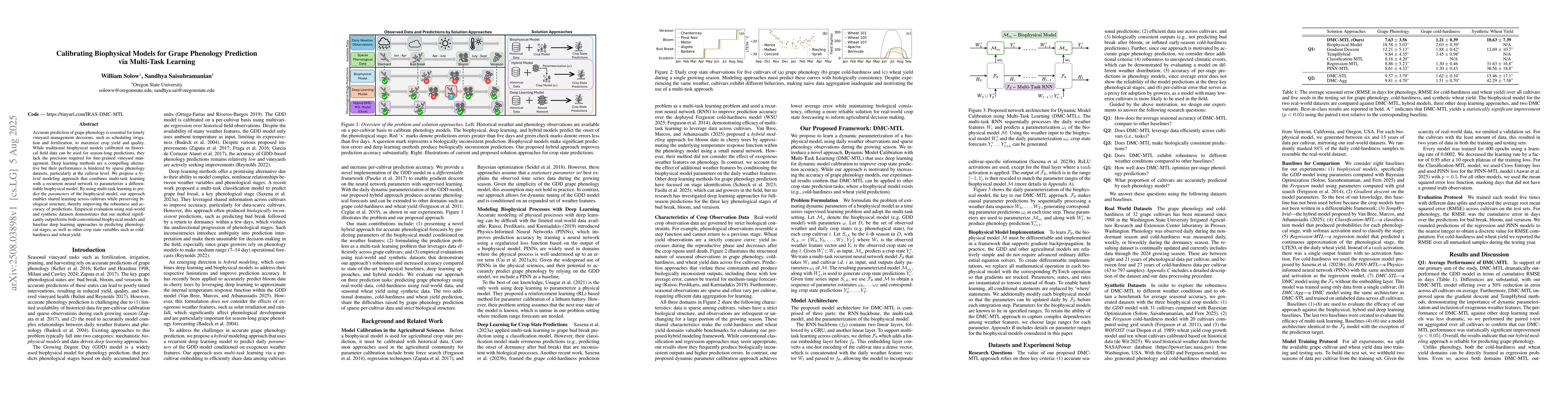 Accurate prediction of grape phenology is essential for timely vineyard management decisions, such as scheduling irrigation and fertilization, to maximize crop yield and quality. While traditional biophysical models calibrated on historical field data can be used for season-long predictions, they lack the precision required for fine-grained vineyard management. Deep learning methods are a compelling alternative but their performance is hindered by sparse phenology datasets, particularly at the cultivar level. We propose a hybrid modeling approach that combines multi-task learning with a recurrent neural network to parameterize a differentiable biophysical model. By using multi-task learning to predict the parameters of the biophysical model, our approach enables shared learning across cultivars while preserving biological structure, thereby improving the robustness and accuracy of predictions. Empirical evaluation using real-world and synthetic datasets demonstrates that our method significantly outperforms both conventional biophysical models and baseline deep learning approaches in predicting phenological stages, as well as other crop state variables such as cold-hardiness and wheat yield.