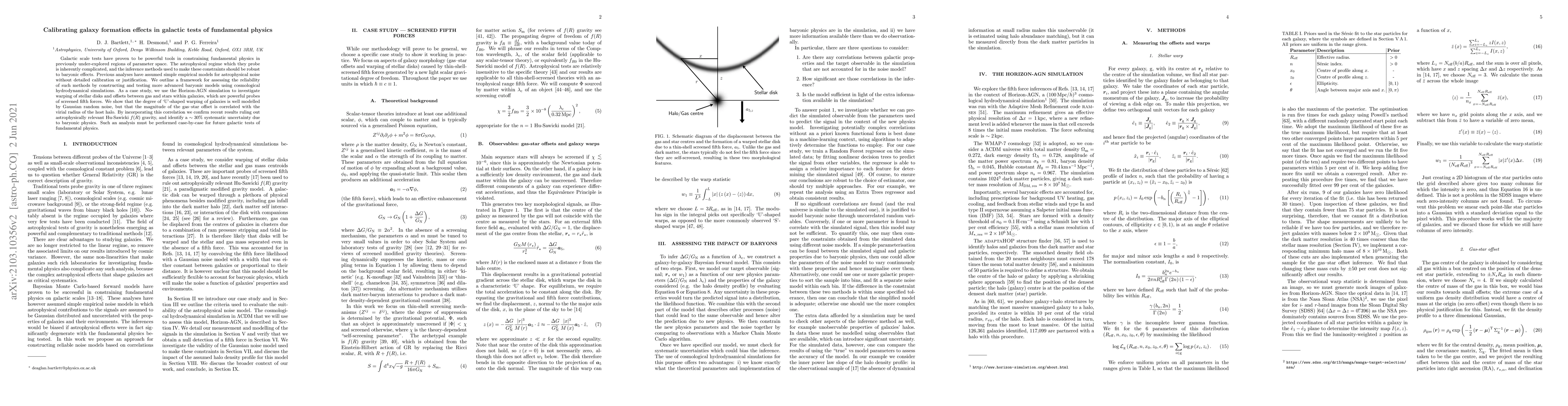 Galactic scale tests have proven to be powerful tools in constraining fundamental physics in previously under-explored regions of parameter space. The astrophysical regime which they probe is inherently complicated, and the inference methods used to make these constraints should be robust to baryonic effects. Previous analyses have assumed simple empirical models for astrophysical noise without detailed calibration or justification. We outline a framework for assessing the reliability of such methods by constructing and testing more advanced baryonic models using cosmological hydrodynamical simulations. As a case study, we use the Horizon-AGN simulation to investigate warping of stellar disks and offsets between gas and stars within galaxies, which are powerful probes of screened fifth forces. We show that the degree of `U'-shaped warping of galaxies is well modelled by Gaussian random noise, but that the magnitude of the gas-star offset is correlated with the virial radius of the host halo. By incorporating this correlation we confirm recent results ruling out astrophysically relevant Hu-Sawicki $f(R)$ gravity, and identify a $\sim 30\%$ systematic uncertainty due to baryonic physics. Such an analysis must be performed case-by-case for future galactic tests of fundamental physics.