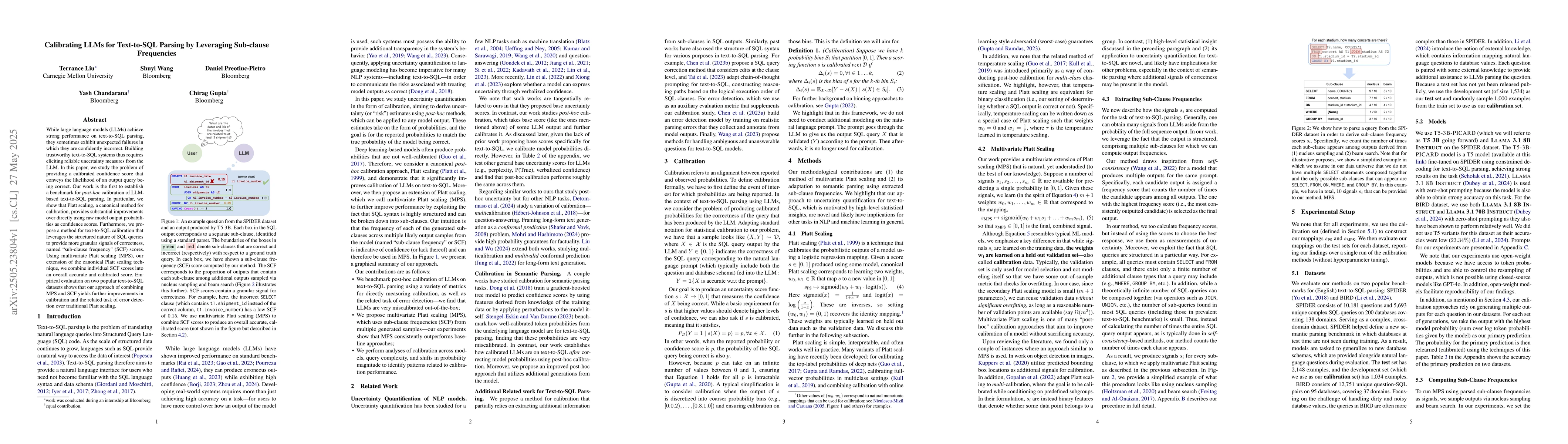 While large language models (LLMs) achieve strong performance on text-to-SQL parsing, they sometimes exhibit unexpected failures in which they are confidently incorrect. Building trustworthy text-to-SQL systems thus requires eliciting reliable uncertainty measures from the LLM. In this paper, we study the problem of providing a calibrated confidence score that conveys the likelihood of an output query being correct. Our work is the first to establish a benchmark for post-hoc calibration of LLM-based text-to-SQL parsing. In particular, we show that Platt scaling, a canonical method for calibration, provides substantial improvements over directly using raw model output probabilities as confidence scores. Furthermore, we propose a method for text-to-SQL calibration that leverages the structured nature of SQL queries to provide more granular signals of correctness, named "sub-clause frequency" (SCF) scores. Using multivariate Platt scaling (MPS), our extension of the canonical Platt scaling technique, we combine individual SCF scores into an overall accurate and calibrated score. Empirical evaluation on two popular text-to-SQL datasets shows that our approach of combining MPS and SCF yields further improvements in calibration and the related task of error detection over traditional Platt scaling.