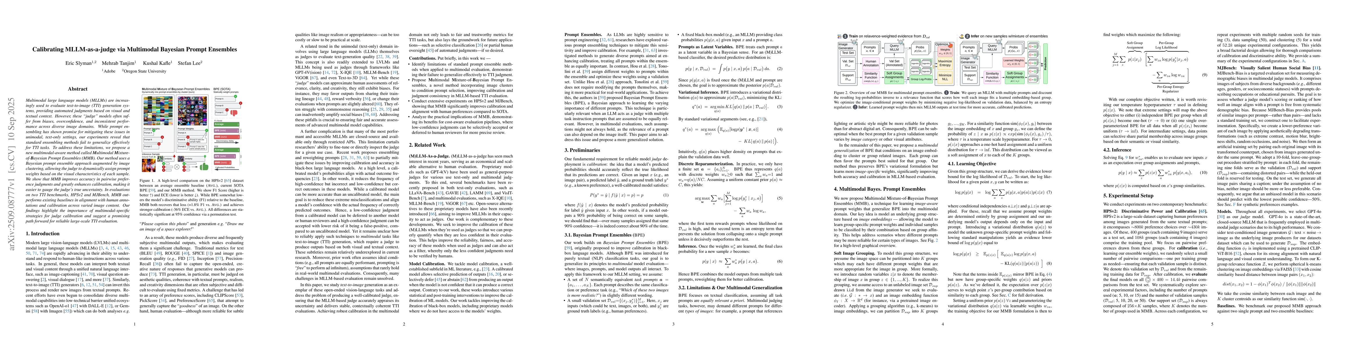 Multimodal large language models (MLLMs) are increasingly used to evaluate text-to-image (TTI) generation systems, providing automated judgments based on visual and textual context. However, these "judge" models often suffer from biases, overconfidence, and inconsistent performance across diverse image domains. While prompt ensembling has shown promise for mitigating these issues in unimodal, text-only settings, our experiments reveal that standard ensembling methods fail to generalize effectively for TTI tasks. To address these limitations, we propose a new multimodal-aware method called Multimodal Mixture-of-Bayesian Prompt Ensembles (MMB). Our method uses a Bayesian prompt ensemble approach augmented by image clustering, allowing the judge to dynamically assign prompt weights based on the visual characteristics of each sample. We show that MMB improves accuracy in pairwise preference judgments and greatly enhances calibration, making it easier to gauge the judge's true uncertainty. In evaluations on two TTI benchmarks, HPSv2 and MJBench, MMB outperforms existing baselines in alignment with human annotations and calibration across varied image content. Our findings highlight the importance of multimodal-specific strategies for judge calibration and suggest a promising path forward for reliable large-scale TTI evaluation.
