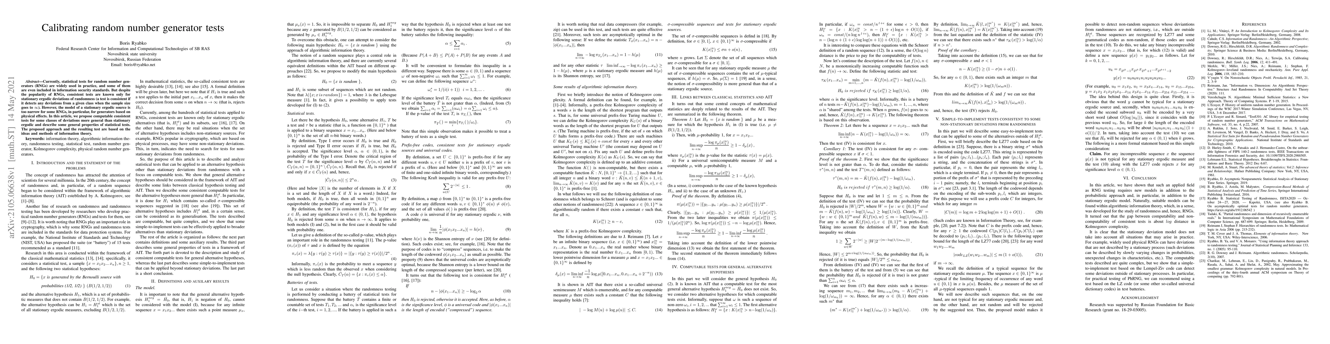 Currently, statistical tests for random number generators (RNGs) are widely used in practice, and some of them are even included in information security standards. But despite the popularity of RNGs, consistent tests are known only for stationary ergodic deviations of randomness (a test is consistent if it detects any deviations from a given class when the sample size goes to $ \infty $). However, the model of a stationary ergodic source is too narrow for some RNGs, in particular, for generators based on physical effects. In this article, we propose computable consistent tests for some classes of deviations more general than stationary ergodic and describe some general properties of statistical tests. The proposed approach and the resulting test are based on the ideas and methods of information theory.