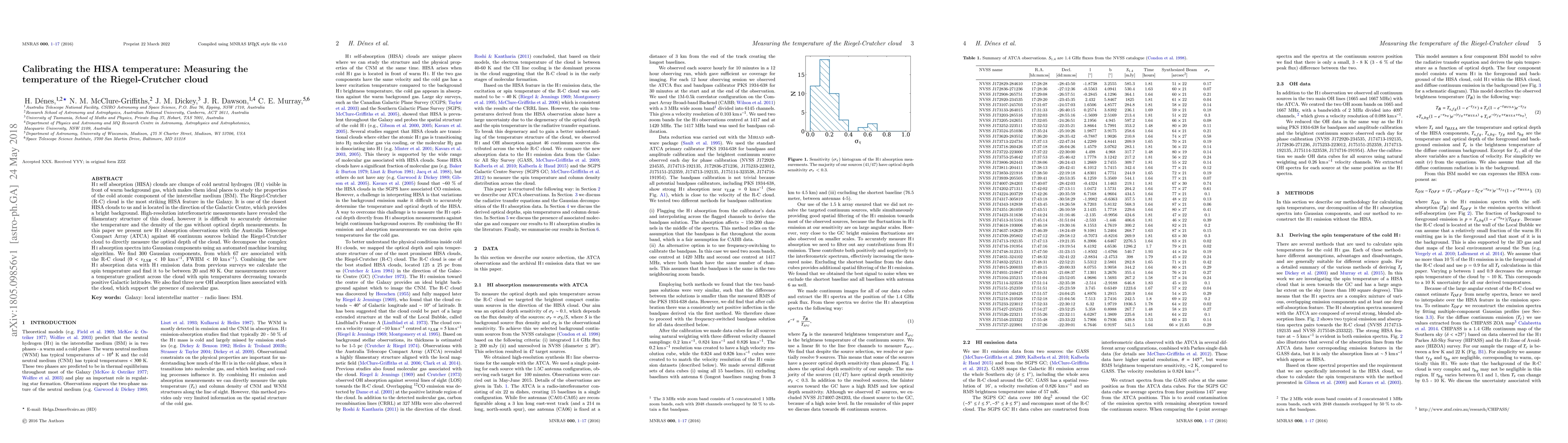 HI self absorption (HISA) clouds are clumps of cold neutral hydrogen (HI) visible in front of warm background gas, which makes them ideal places to study the properties of the cold atomic component of the interstellar medium (ISM). The Riegel-Crutcher (R-C) cloud is the most striking HISA feature in the Galaxy. It is one of the closest HISA clouds to us and is located in the direction of the Galactic Centre, which provides a bright background. High-resolution interferometric measurements have revealed the filamentary structure of this cloud, however it is difficult to accurately determine the temperature and the density of the gas without optical depth measurements. In this paper we present new HI absorption observations with the Australia Telescope Compact Array (ATCA) against 46 continuum sources behind the Riegel-Crutcher cloud to directly measure the optical depth of the cloud. We decompose the complex HI absorption spectra into Gaussian components using an automated machine learning algorithm. We find 300 Gaussian components, from which 67 are associated with the R-C cloud (0 < v_{LSR} < 10 kms, FWHM < 10 kms). Combining the new HI absorption data with HI emission data from previous surveys we calculate the spin temperature and find it to be between 20 and 80 K. Our measurements uncover a temperature gradient across the cloud with spin temperatures decreasing towards positive Galactic latitudes. We also find three new OH absorption lines associated with the cloud, which support the presence of molecular gas.