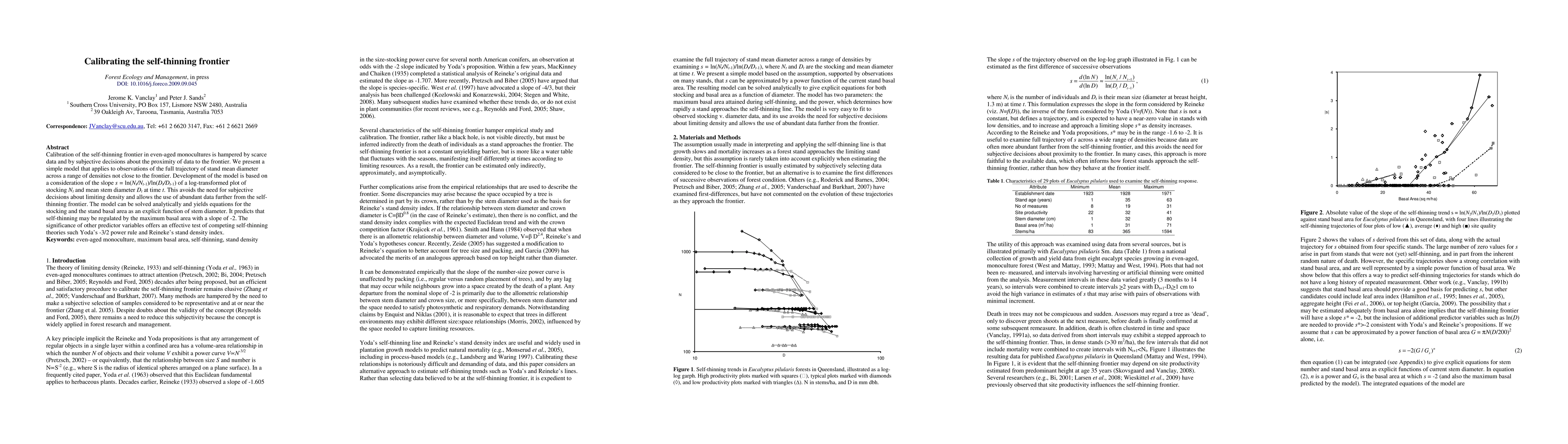 Calibration of the self-thinning frontier in even-aged monocultures is hampered by scarce data and by subjective decisions about the proximity of data to the frontier. We present a simple model that applies to observations of the full trajectory of stand mean diameter across a range of densities not close to the frontier. Development of the model is based on a consideration of the slope s=ln(Nt/Nt 1)/ln(Dt/Dt 1) of a log-transformed plot of stocking Nt and mean stem diameter Dt at time t. This avoids the need for subjective decisions about limiting density and allows the use of abundant data further from the self-thinning frontier. The model can be solved analytically and yields equations for the stocking and the stand basal area as an explicit function of stem diameter. It predicts that self-thinning may be regulated by the maximum basal area with a slope of -2. The significance of other predictor variables offers an effective test of competing self-thinning theories such Yoda's -3/2 power rule and Reineke's stand density index.
