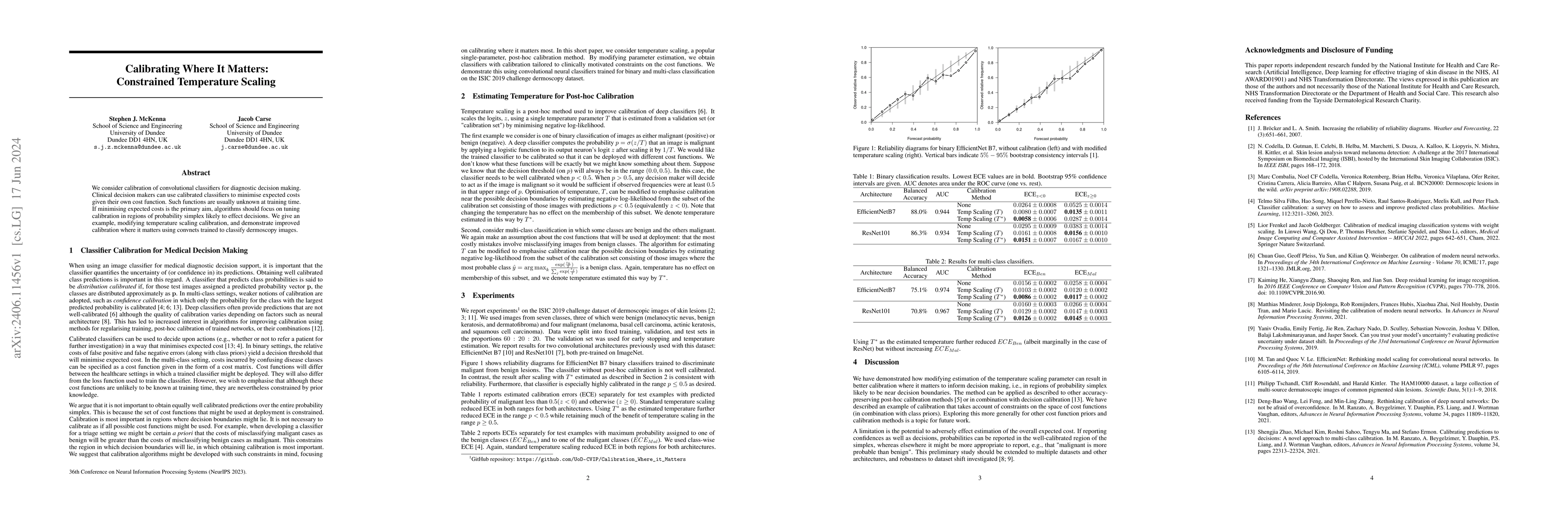 We consider calibration of convolutional classifiers for diagnostic decision making. Clinical decision makers can use calibrated classifiers to minimise expected costs given their own cost function. Such functions are usually unknown at training time. If minimising expected costs is the primary aim, algorithms should focus on tuning calibration in regions of probability simplex likely to effect decisions. We give an example, modifying temperature scaling calibration, and demonstrate improved calibration where it matters using convnets trained to classify dermoscopy images.