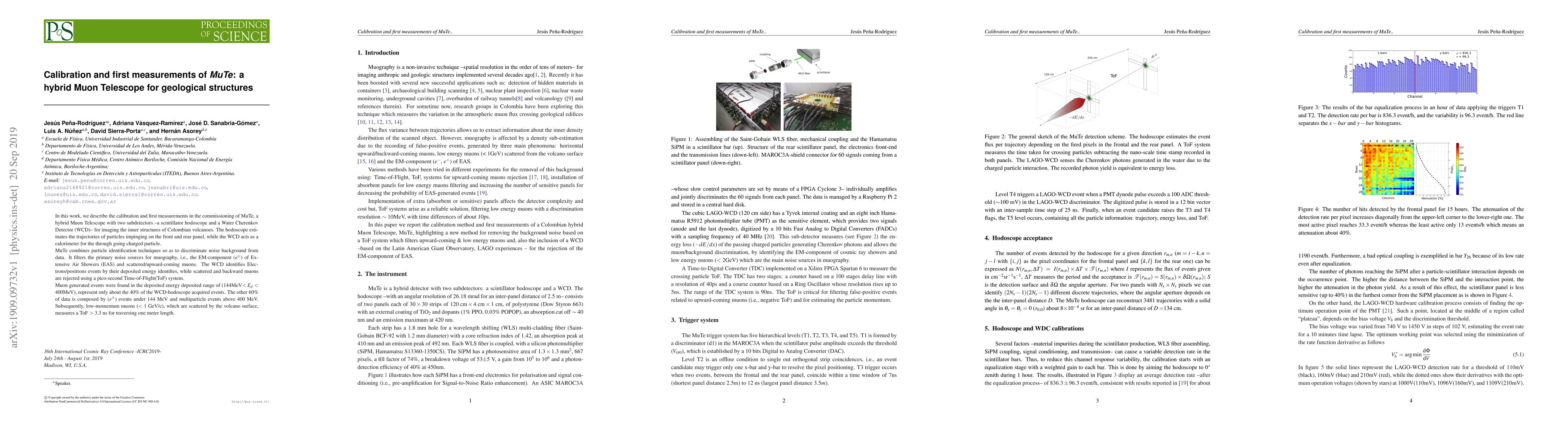This paper presents the calibration and initial measurements of MuTe, a hybrid muon telescope designed to image the inner structures of Colombian volcanoes. The telescope combines a scintillator hodoscope and a Water Cherenkov Detector to identify and filter muons, distinguishing them from background noise, and successfully detected muons in the energy range of 144 MeV to 400 MeV.