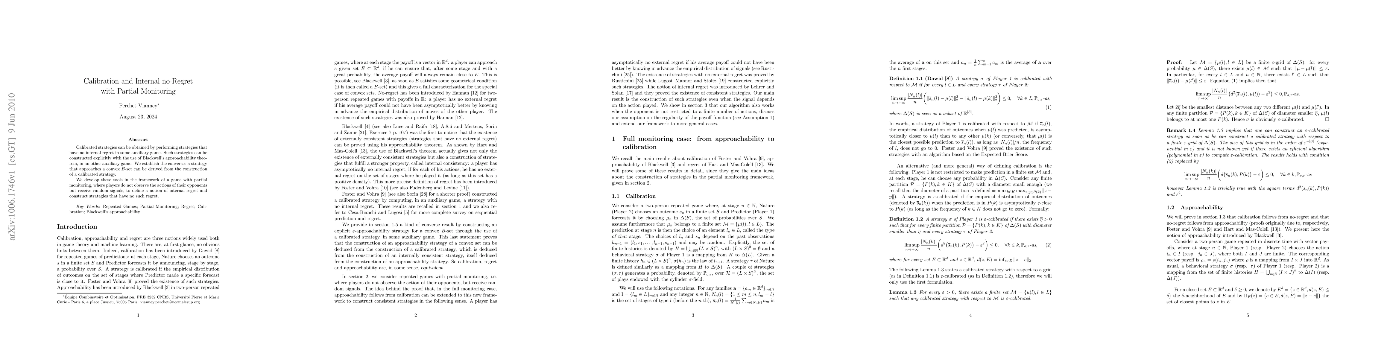 This paper develops calibrated strategies in games with partial monitoring using Blackwell's approachability theorem, showing that strategies with no internal regret can be explicitly constructed. It establishes a converse, demonstrating that strategies approaching a convex $B$-set can be derived from calibrated strategies.