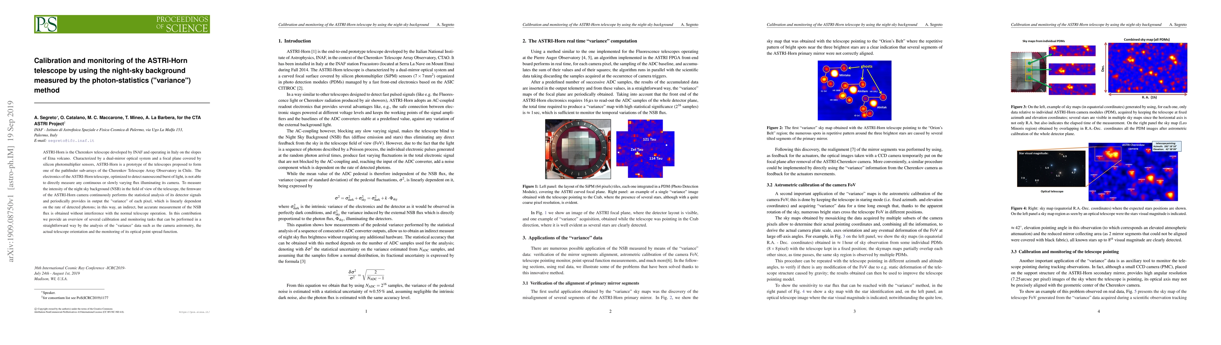 This paper discusses the calibration and monitoring of the ASTRI-Horn telescope using the photon-statistics method to measure the night sky background. It highlights how the telescope's firmware analyzes detector signals to obtain an accurate, indirect measurement of the night sky background flux, enabling tasks like astrometry, orientation, and optical point spread function monitoring.